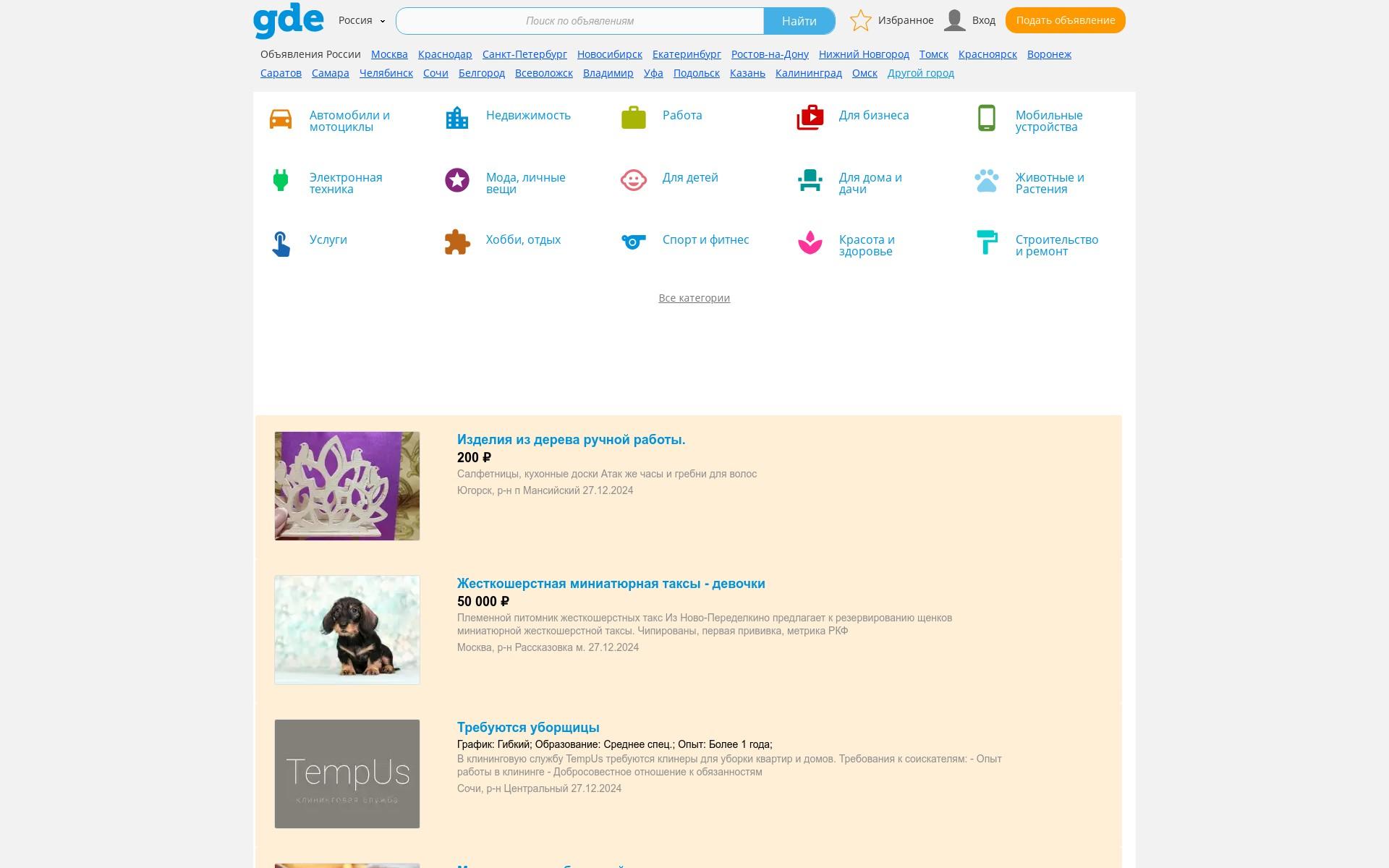 Доска объявлений gde.ru успешный проект с миллионной аудиторией каждый месяц и стабильным доходом. Большой потенциал роста. 2500 населенных пунктов в России. 5 миллионов объявлений. Топовые позиции в поисковиках