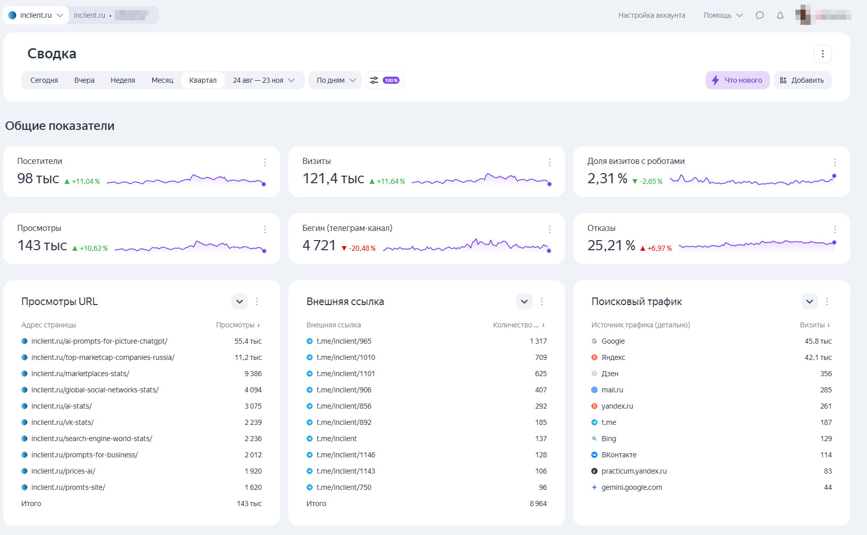 Сайт содержит более 100 статей - https://inclient.ru/post-sitemap.xml, есть и целевые страницы - https://inclient.ru/page-sitemap.xml.