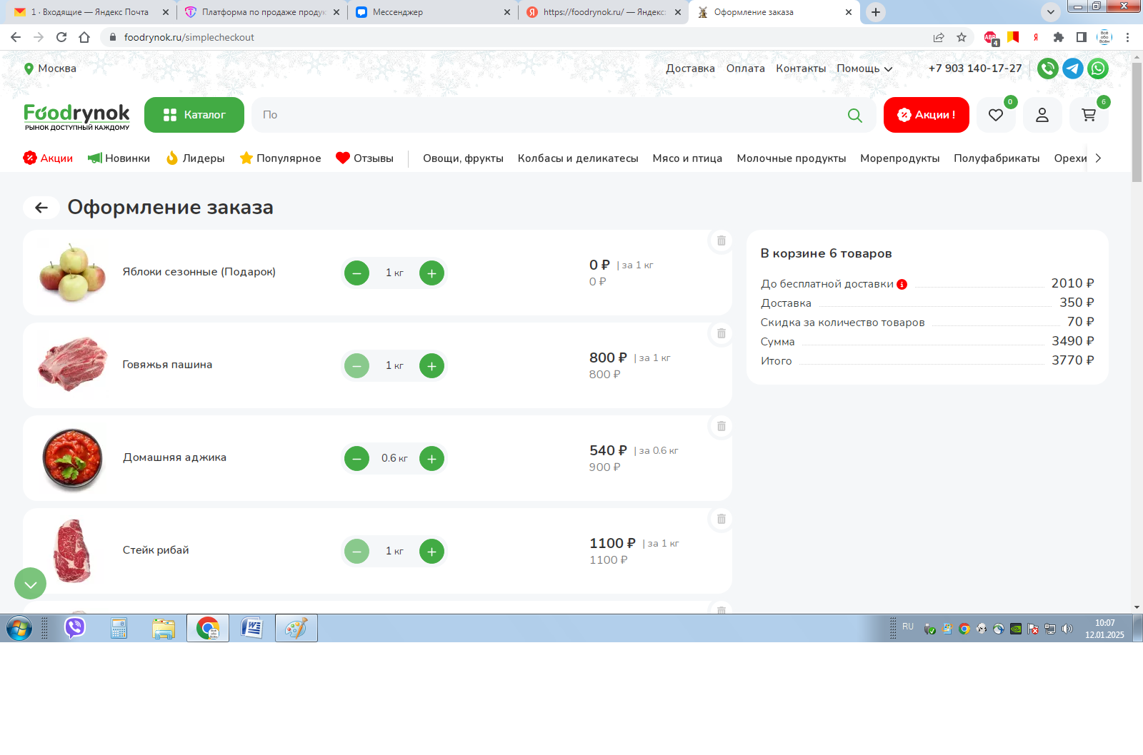 Сайт занимается доставкой продуктов с рынка на дом. Весь товарный ассортимент который сейчас имеется на сайте а это более 900 товаров были полностью взяты за основу с рынка города Люберец и в ручном режиме добавлялось вместе с описанием, фото – все фотографии прорабатывал на белом фоне и тд (ВНИМАНИЕ ассортимент на любом рынке практически одинаковый, даже в магазинах тоже самое практически по ассортименту). Можно подстроить под конкретные рынки в разных городах. Это не шаблонный сайт - функционал совершенный, чего только стоит личный кабинет покупателя - можете зарегистрироваться и просмотреть. Даже функционал битрикса отдыхает! Все налоги оплачены, все отчеты сданы!!! Сайт приведен в полное соответствие с требованиями РКН. ЯВЛЯЕТСЯ ОПЕРАТОРОМ ПЕРСОНАЛЬНЫХ ДАННЫХ (смотрите скрин). Сейчас без этого большие штрафы для любых сайтов!!! Отдаю вместе с сервером - тоесть со всеми данными под ключ.
