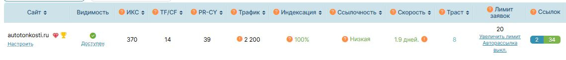 Естественный ссылочный профиль сформировавшийся за время работы сайта TF/CF = 7/14, DR = 26