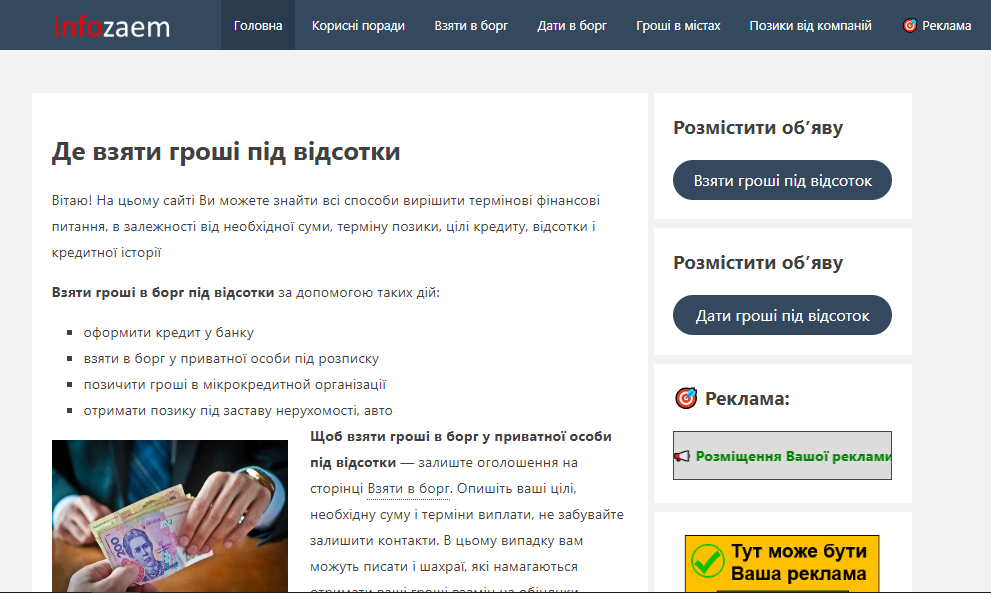 Сайт перспективной тематики (финансы), пользователи подают объявления (кредиторы, заёмщики). Сайт заточен под UA регион. Сайт работает с 2018 года. Звучный домен по тематике ресурса, международная доменная зона.