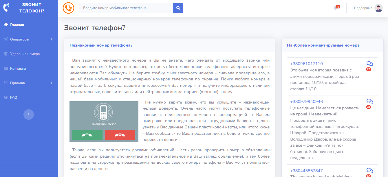 Уникальный сайт - телефонный справочник UA номеров (отзывы о мобильных и стационарных номерах телефонов всех украинских операторов), пользователи сами подают отзывы. Сайт работает с ноября 2021 года. Звучный домен по тематике ресурса, тематическая доменная зона.