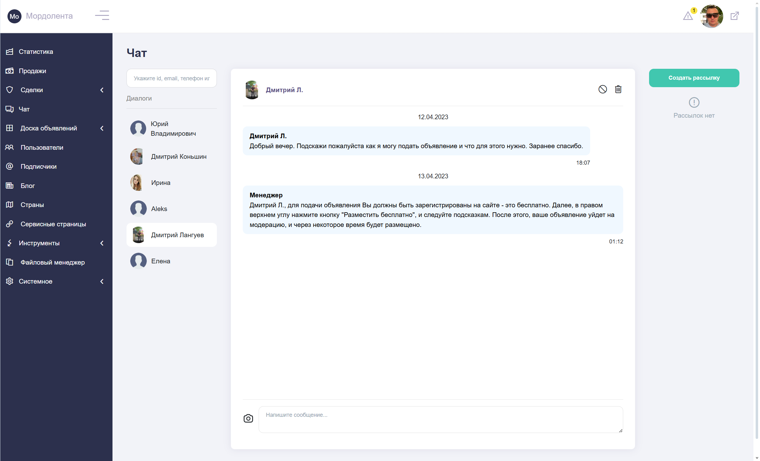 - Посетители имеют возможность связываться с админом в чате (см. скрин).
