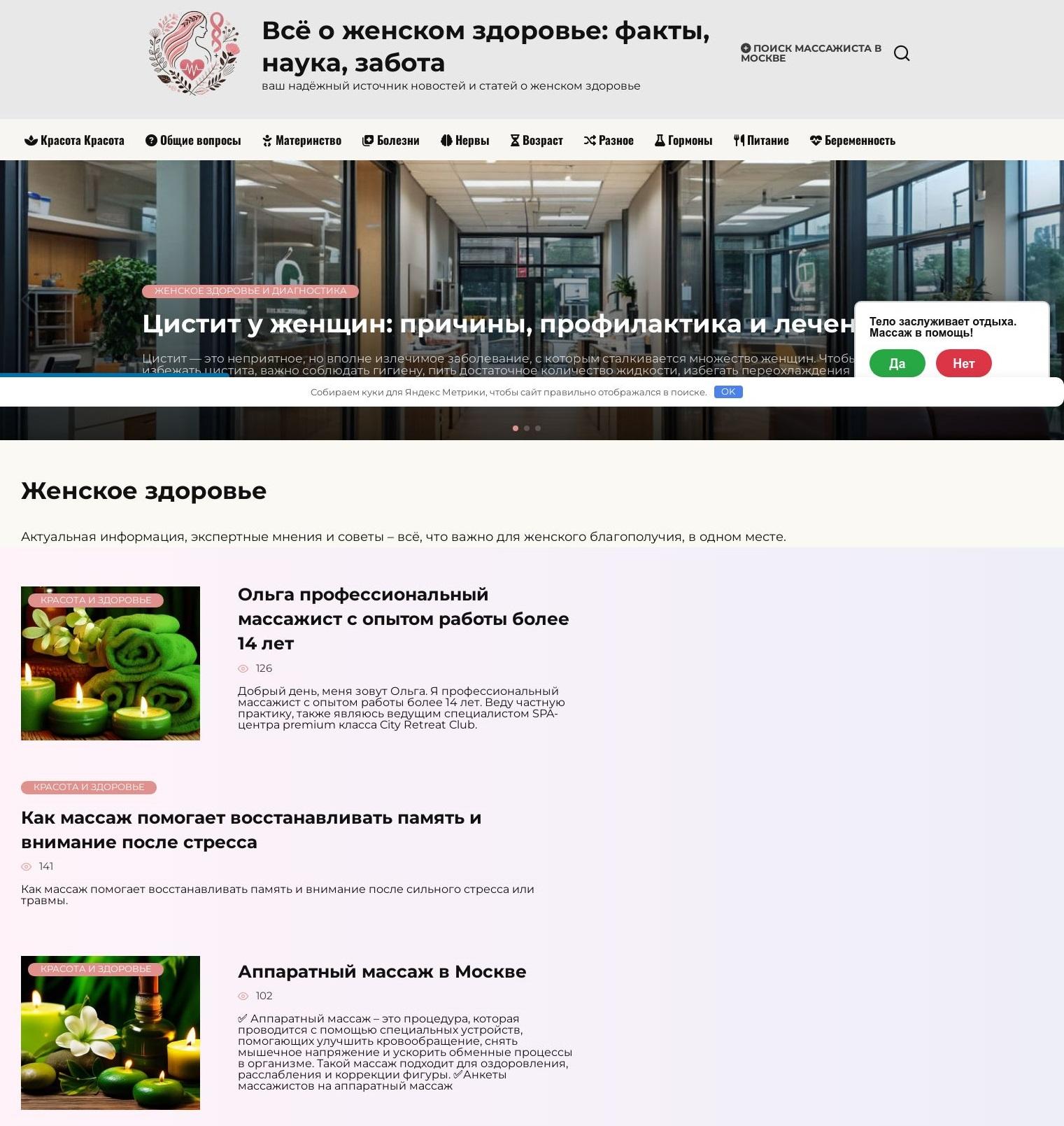 Этот сайт посвящен теме женского здоровья и красоты, предоставляя пользователям информацию о различных медицинских услугах и процедурах, таких как прием гинеколога, клиники для беременных, а также вопросы красоты и нетрадиционной медицины. Целевой аудиторией являются женщины, интересующиеся здоровьем и внешним видом, а также мужчины, заботящиеся о здоровье своих партнеров. Контент на сайте включает в себя информацию о клиниках, врачах и различных процедурах, что положительно влияет на SEO, поскольку эта информация часто ищется в интернете.