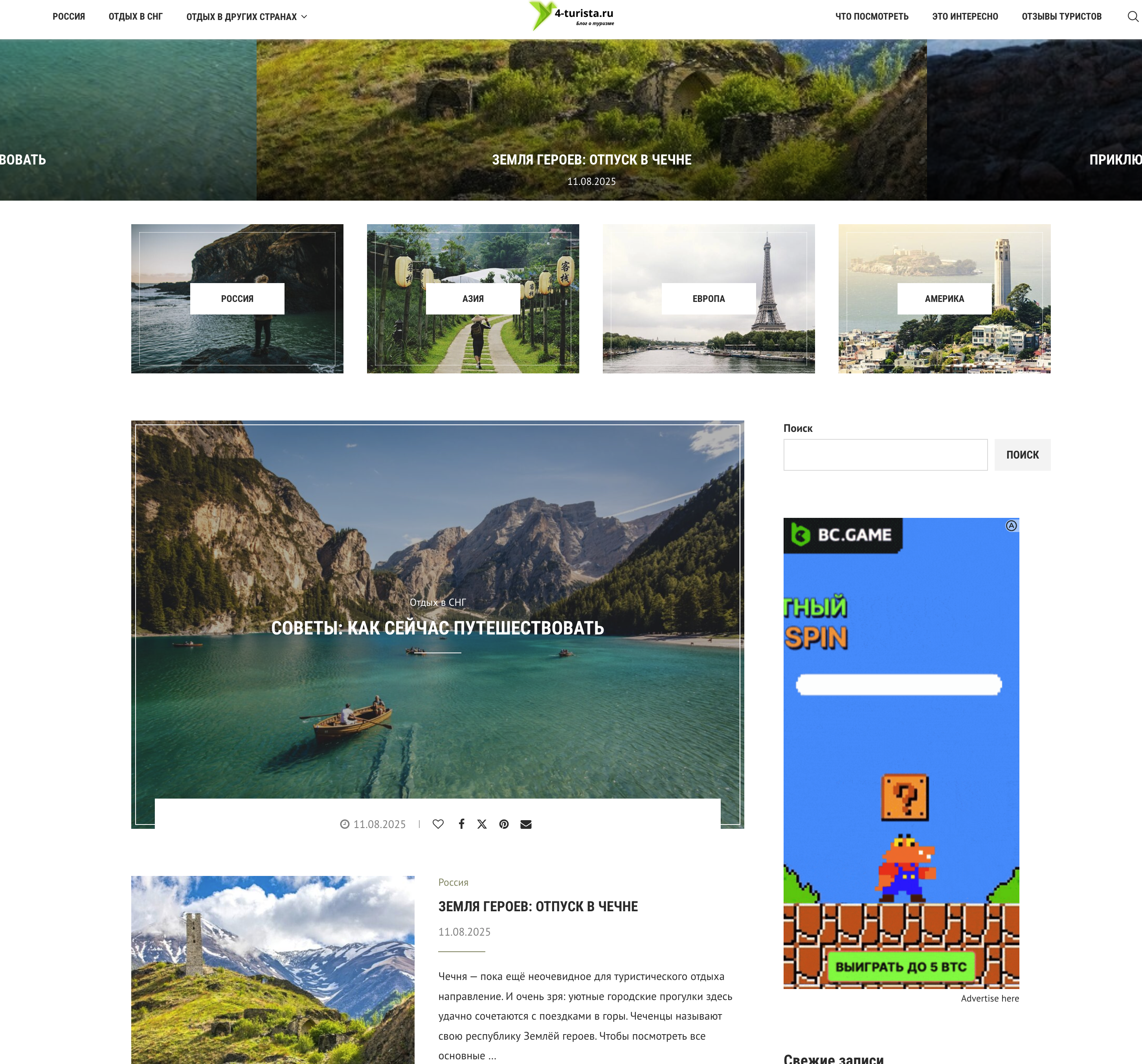 Автонаполняемый сайт о туризме. Автонаполнение плагином, без лишнего мусора. Установлена премиум тема от soledad с широкой возможностью интегрирования рекламных блоков. Добавлена контекстная реклама от ads.vk. Сайт добавлен в ГГЛ. На сайте 100+ публикаций.