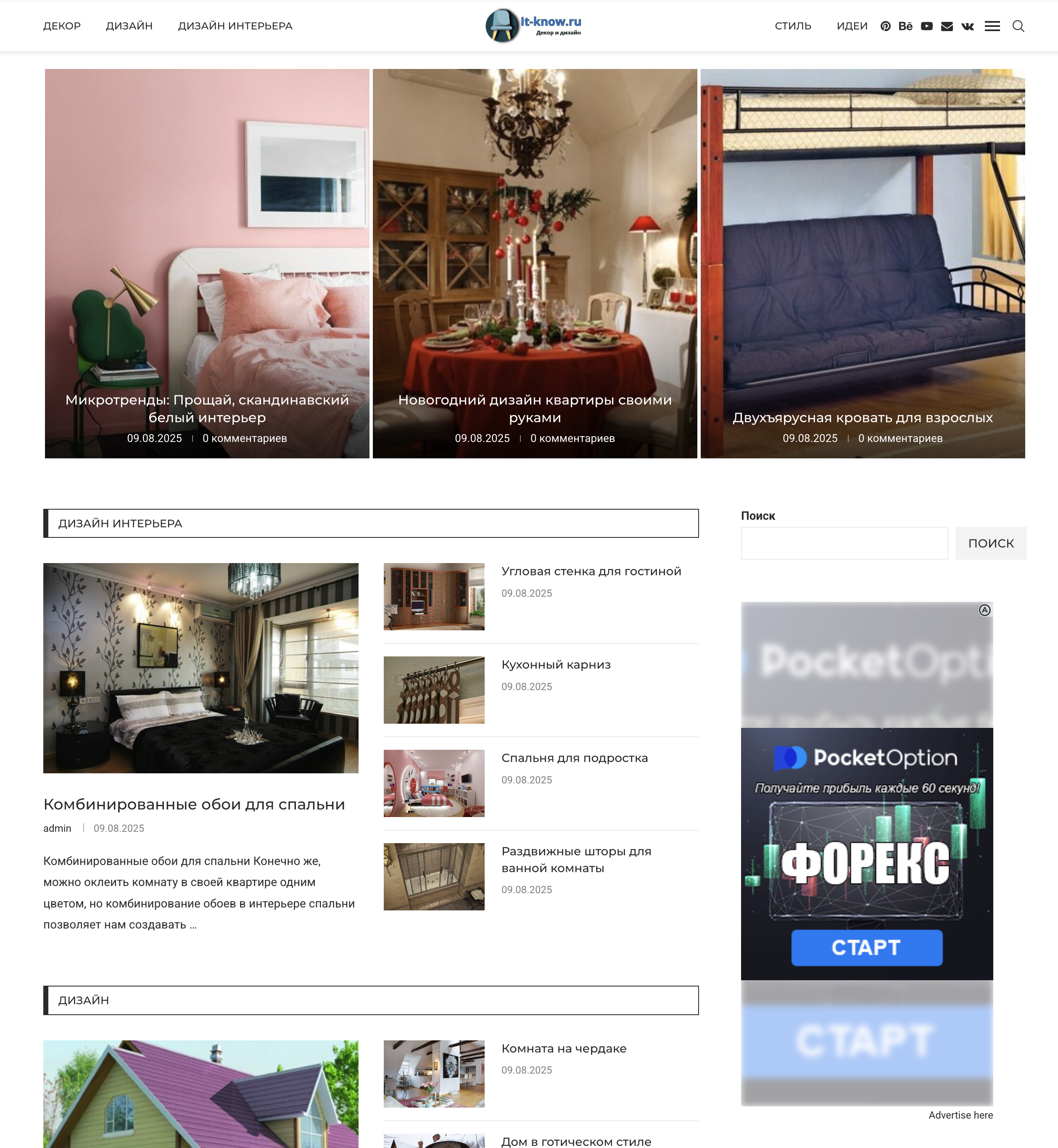 Автонаполняемый сайт о Декоре и дизайне. Автонаполнение плагином, без лишнего мусора. Установлена премиум тема от soledad с широкой возможностью интегрирования рекламных блоков. Добавлена контекстная реклама от ads.vk. Сайт добавлен в ГГЛ. На сайте 440+ публикаций. Добавлена контекстная реклама от aads.com.