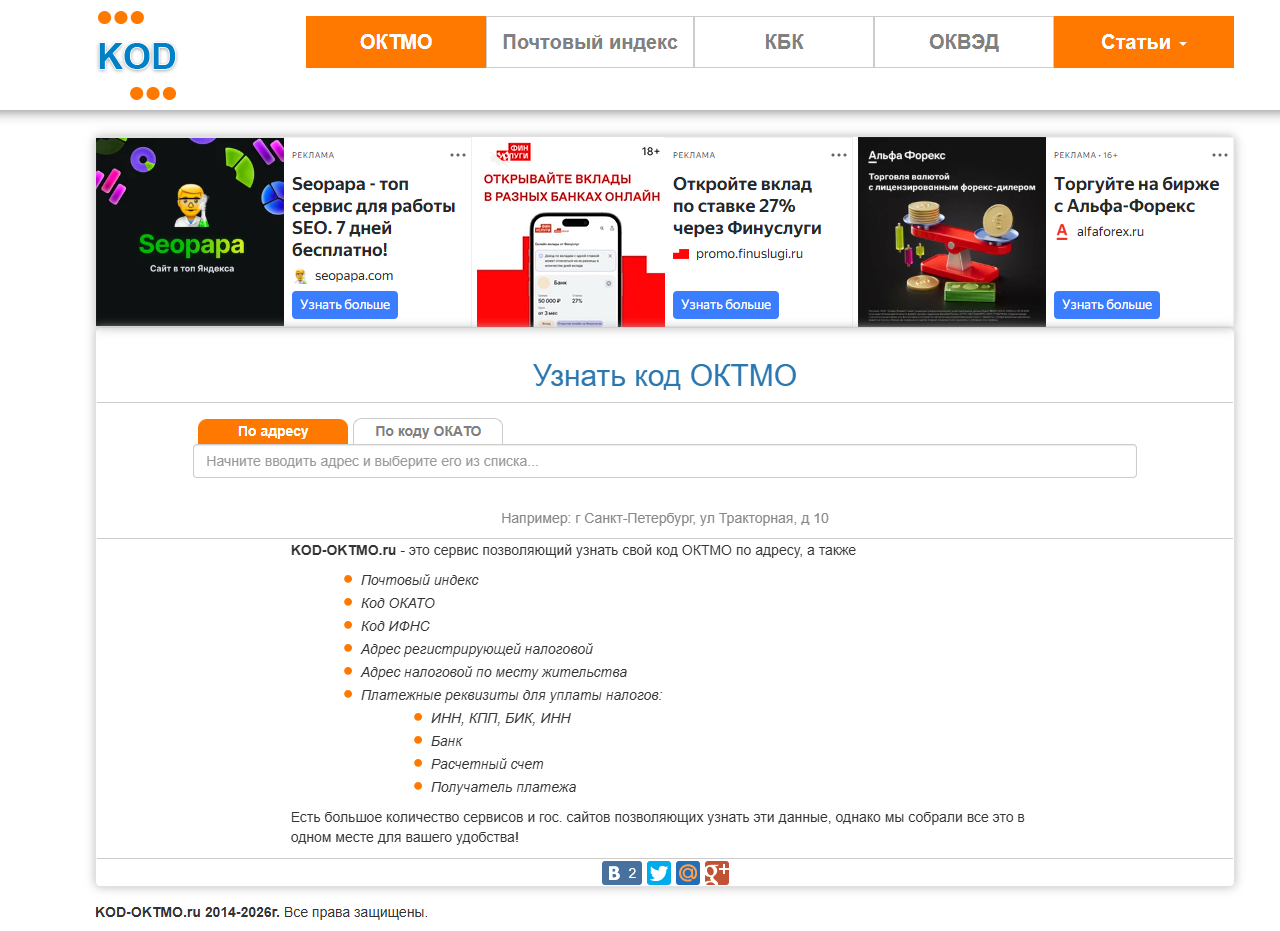 Сайт представляет собой специализированный онлайн-сервис, предоставляющий пользователям удобный и оперативный доступ к информации о кодах ОКТМО — общероссийском классификаторе территорий муниципальных образований, а также связанным сведениям: почтовым индексам, ИФНС, ОКАТО, БИК, ИНН, КПП и адресам налоговых инспекций. Тематика ресурса сосредоточена на административных и налоговых данных, востребованных предпринимателями, компаниями и физическими лицами, ведущими деятельность в России. Сайт позволяет быстро узнать код ОКТМО по адресу, что облегчает заполнение налоговой и бухгалтерской отчетности, а также выполнение других юридически значимых операций, связанных с территориальной принадлежностью бизнеса.