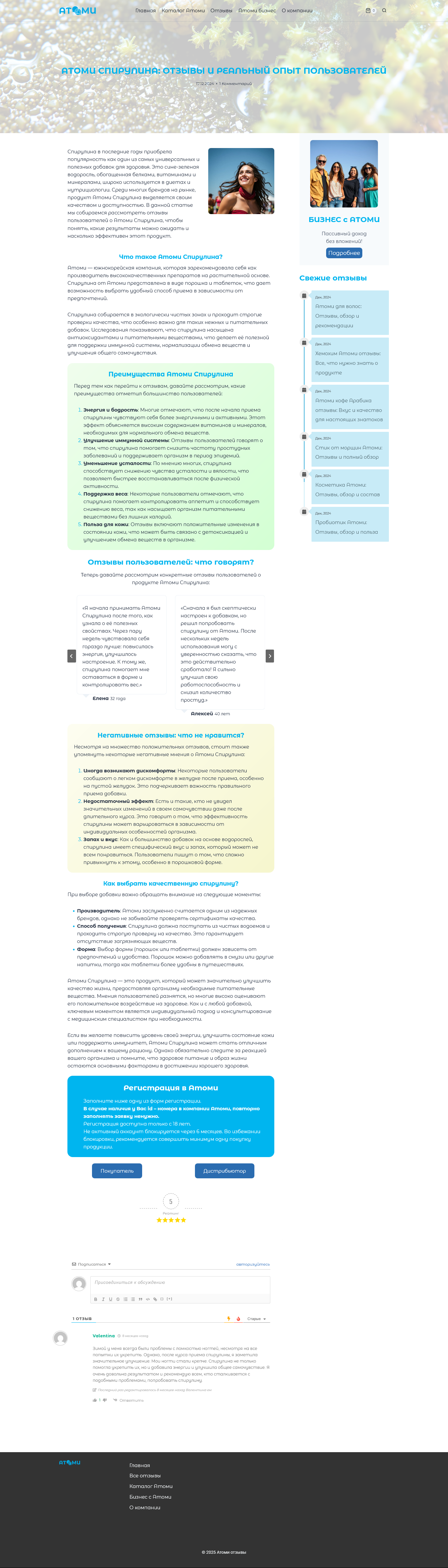 Сайт посвящен обзорам и отзывам о компании Atomy, её продуктах и возможностях построения бизнеса на этой платформе. Тематика сайта охватывает сетевой маркетинг, личностное развитие и подробный анализ ассортимента продукции Atomy — от косметики до средств личной гигиены. Специфика ресурса заключается в объективном разборе преимуществ и недостатков компании, а также в предоставлении актуальной и подробной информации, основанной на опыте пользователей и партнёров. Целевая аудитория — это потенциальные и действующие партнёры Atomy, интересующиеся построением сетевого бизнеса, а также покупатели, выбирающие качественные товары и желающие узнать реальные отзывы перед покупкой.