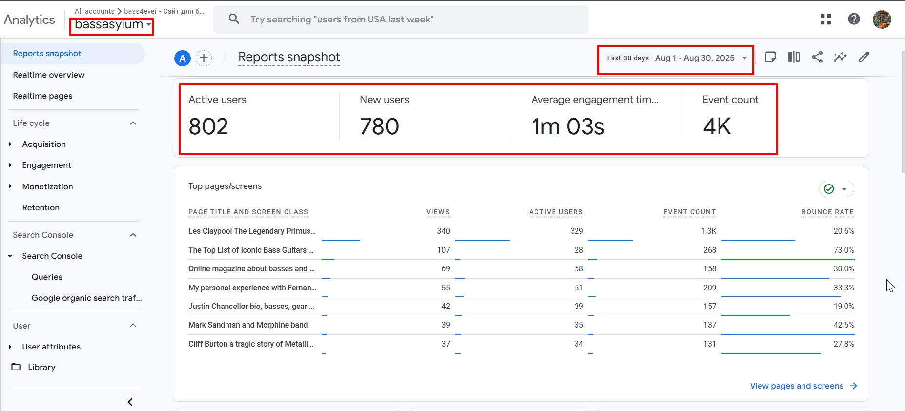 Домену 2+ года. Нишевая тематика бас-гитары и бас-гитаристы. Писал 95% всё сам поскольку глубоко в теме.