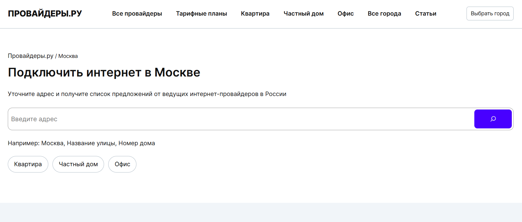 5. Для всех разделов Тарифы, Провайдеры, Квартира, Дом и т.д. сформированы аналогичные разделы под каждый город московской области.