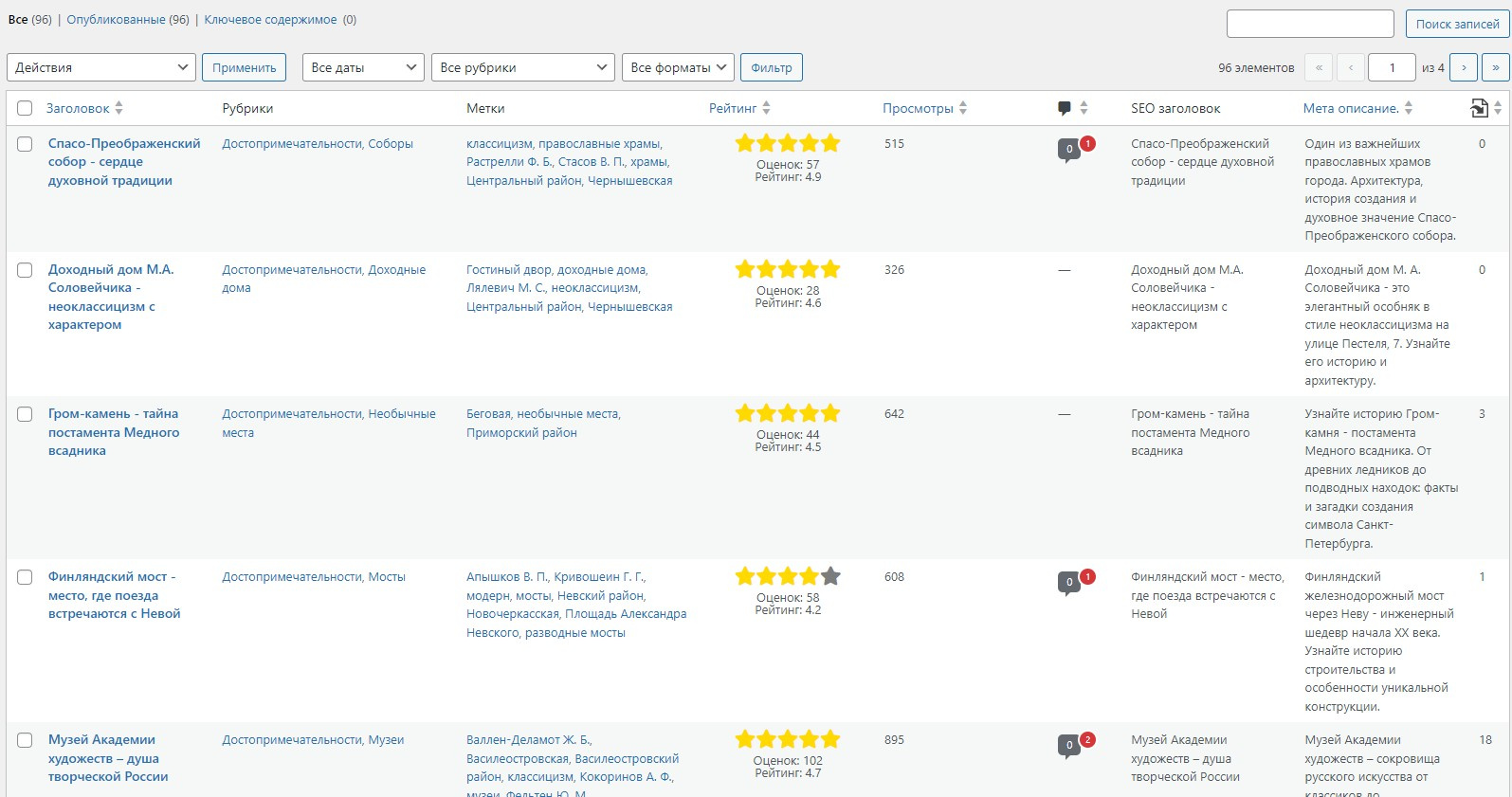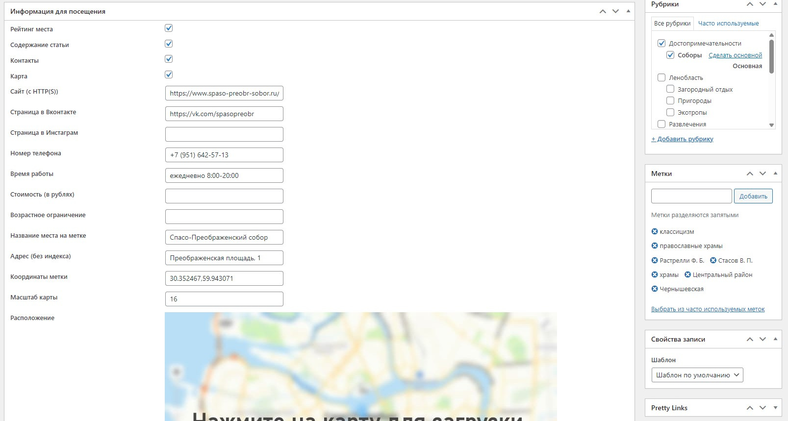 - Добавление характеристик, информации для посещения, точка на карте места прямо из редактора WP.