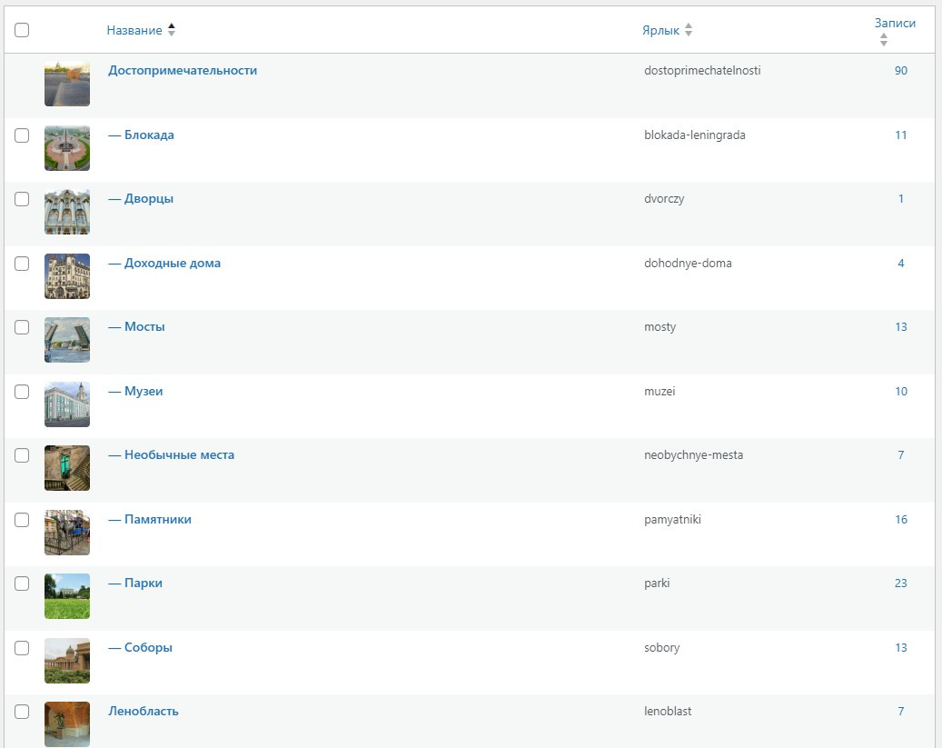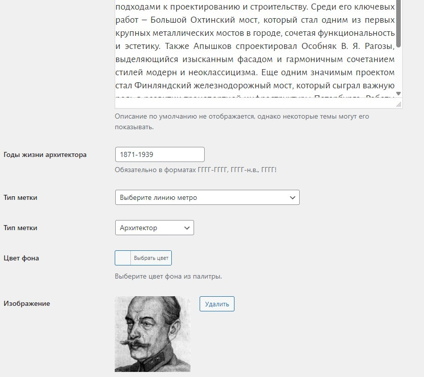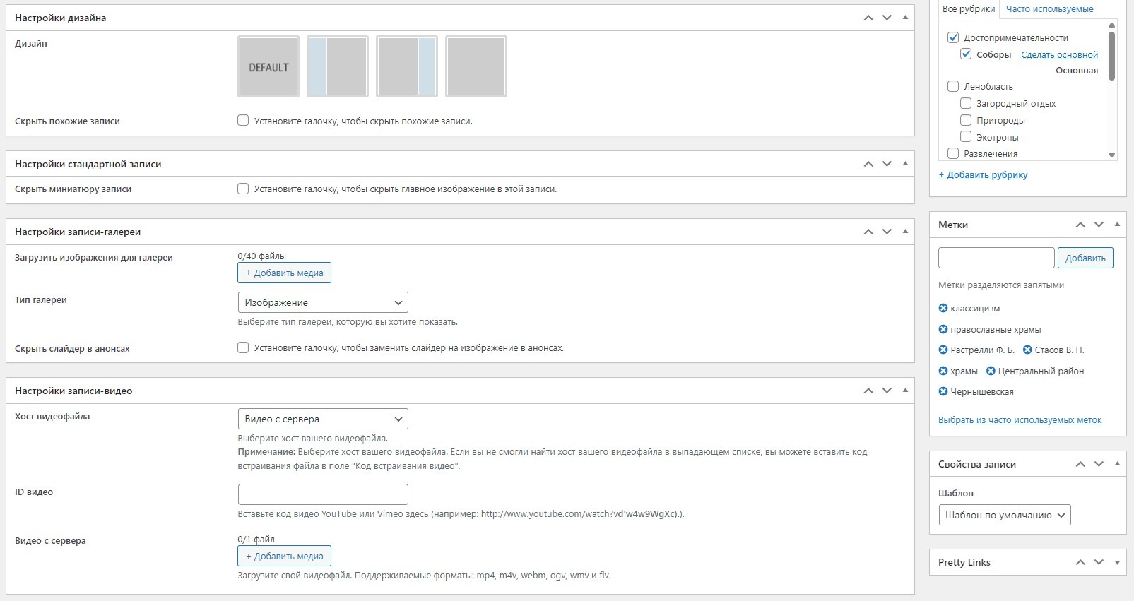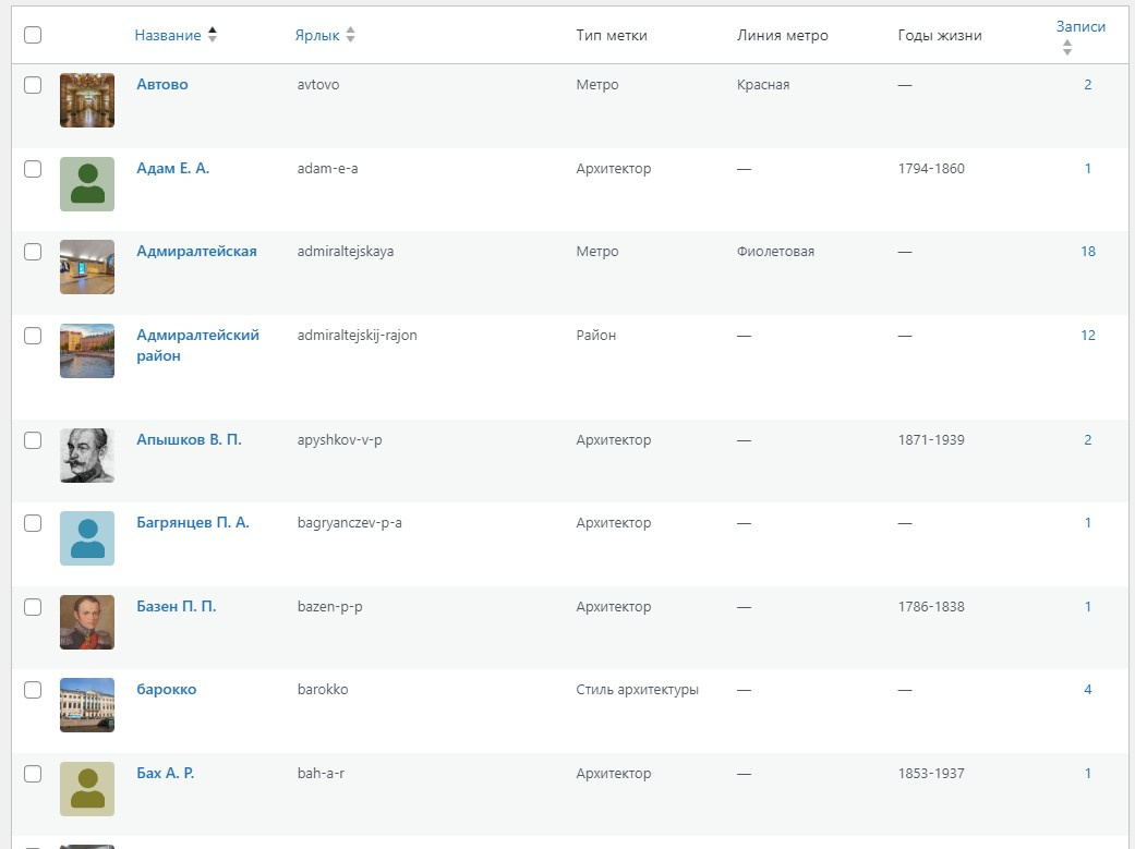 - Выбор миниатюры, цвета и других параметров рубрики и меток в админке.