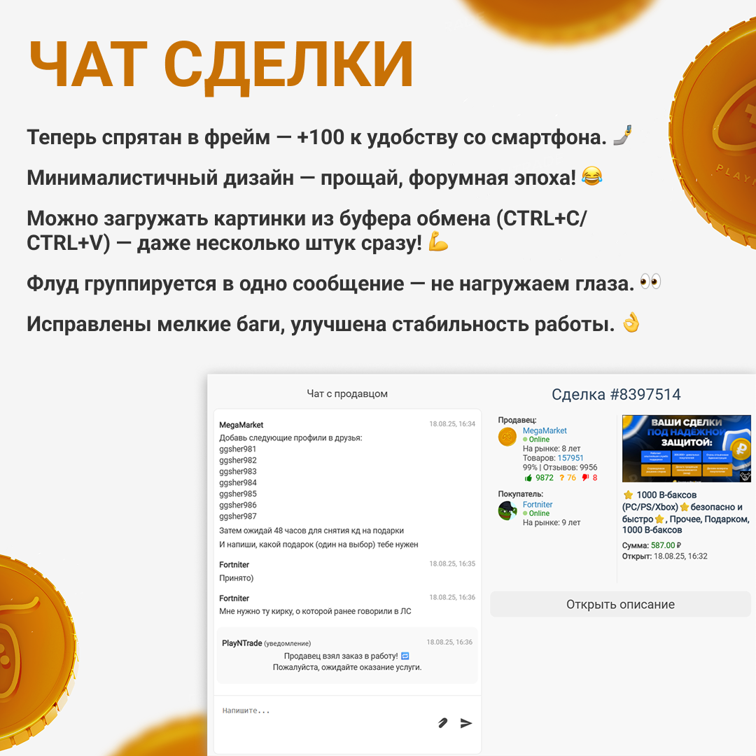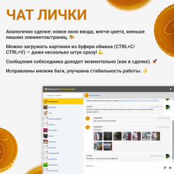 • Удобный и стабильный чат внутри сделки, позволяющий вести переписку в реальном времени, управлять статусом сделки, приглашать в переписку саппорта.