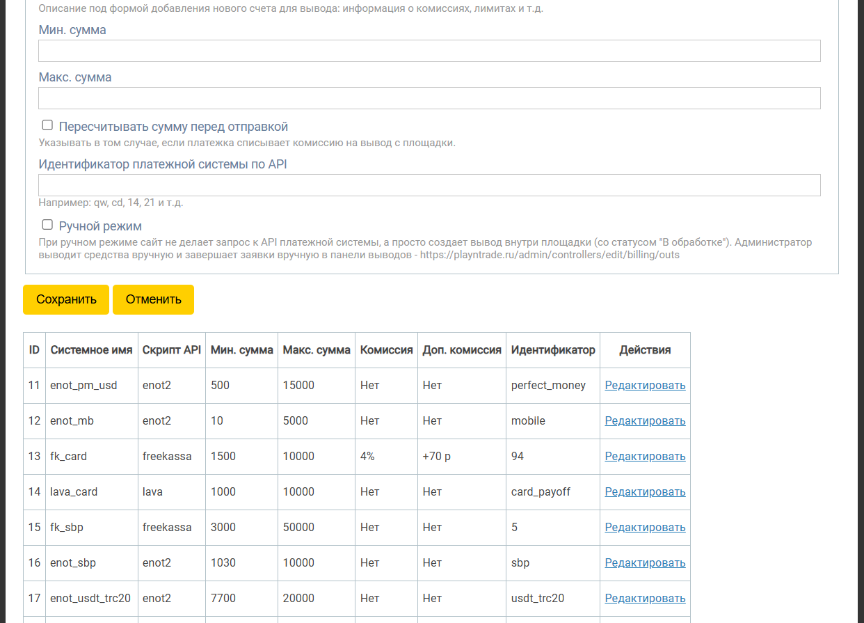 • Админка платежных систем для ввода/вывода средств, позволяющая менять порядок систем для ввода, отключать/включать их, менять описания, переключать вывод на определенный вид кошелька между разными платежками, устанавливать кастомные лимиты/комиссии вывода и т.д.