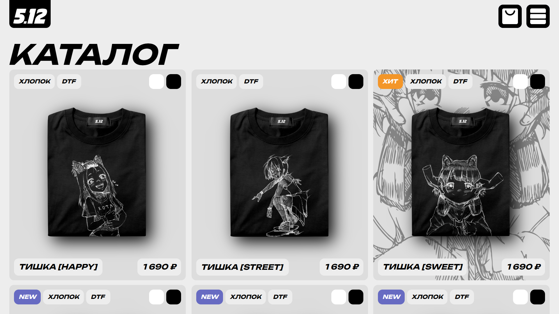 Сайт представляет собой интернет-магазин позиционирующий себя как бренд 5.12, специализирующийся на продаже аниме-мерча и авторских футболок с уникальными дизайнерскими решениями. Тематика сайта ориентирована на поклонников аниме-культуры, что формирует особую нишу в сегменте молодежной и креативной аудитории. Целевой аудиторией выступают молодые люди и поклонники аниме, дизайнерской одежды, которые ищут качественный и необычный мерч с доставкой по территории России.