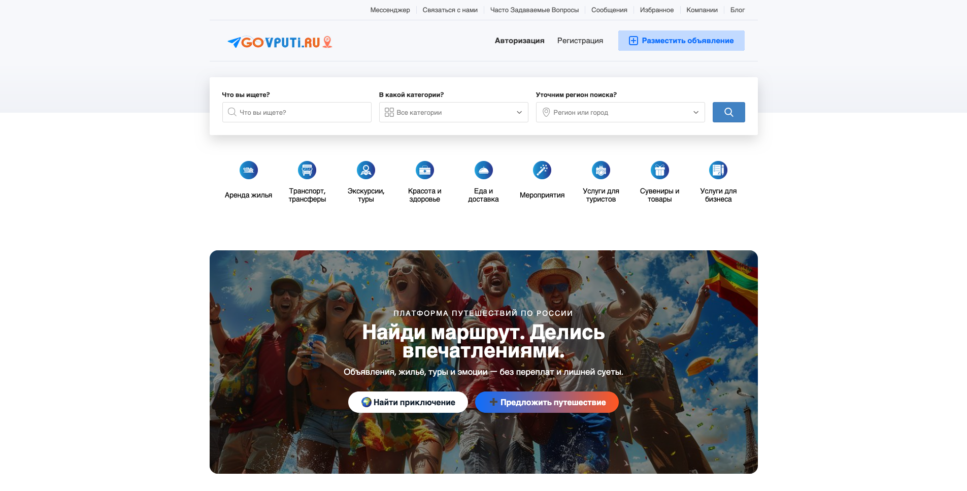 GoVputi.ru — это готовая онлайн-платформа на Osclass 8.3 (PHP 8.3, MySQL, PWA), объединяющая аренду жилья, туры, транспорт, мероприятия и тревел-товары в одной экосистеме.