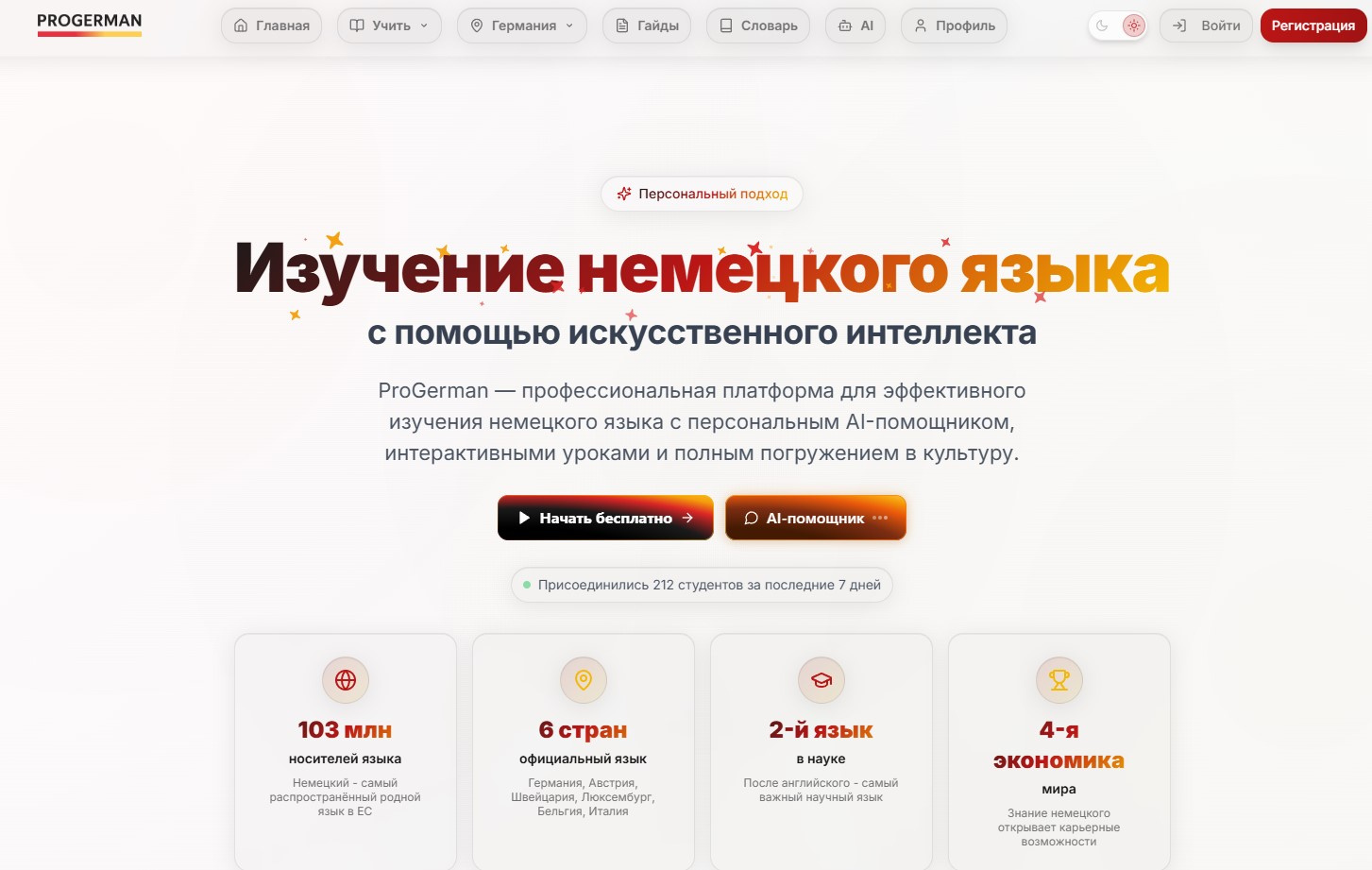 Сайт публикует структурированные гайды, актуальные новости и аналитику по иммиграционным вопросам, проводит индивидуальные и групповые онлайн-занятия по немецкому, размещает базы вакансий и предложений по аренде жилья. Встроенные сервисы на базе ИИ позволяют адаптировать обучение под конкретного пользователя, что увеличивает вовлечённость и повторные посещения. Современный, интуитивно понятный дизайн, адаптация под мобильные устройства и быстрая загрузка страниц способствуют хорошим поведенческим факторам и положительно влияют на SEO. Контент регулярно обновляется, есть возможности для интеграции блогов, форумов, вебинаров — это даёт потенциал для роста органического трафика и дополнительных источников дохода.