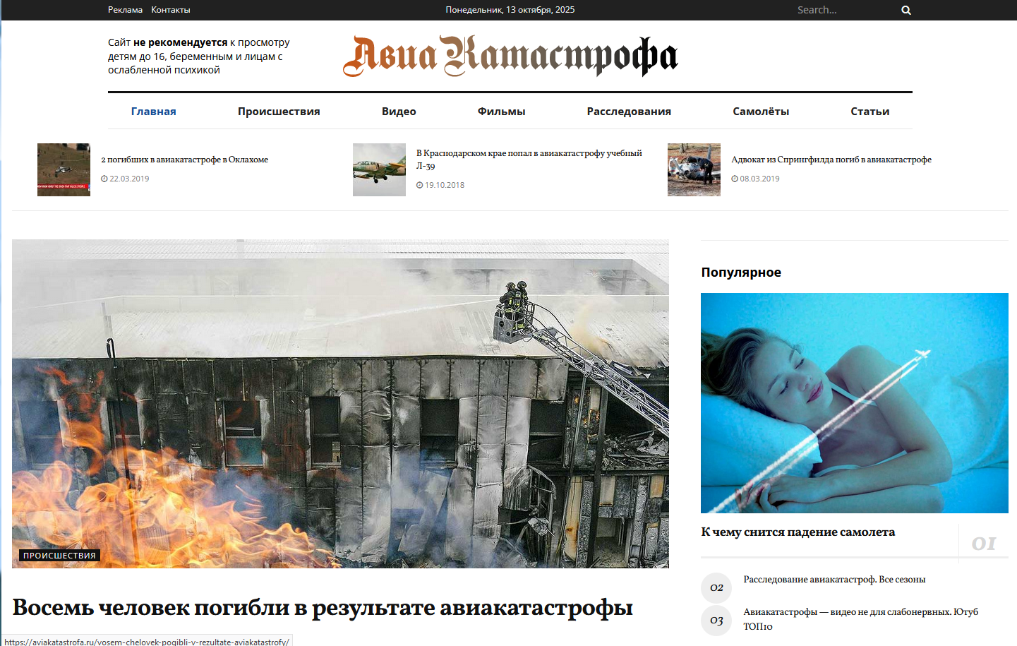 Сайт посвящён теме авиакатастроф, включая последние новости об инцидентах в России и мире, а также подробный разбор причин авиапроисшествий на основе известного документального сериала «Расследование авиакатастроф» (Mayday / Air Crash Investigation). Основное содержание сайта — это актуальные новости, обзоры документальных и художественных фильмов, шокирующие видео, списки погибших в авиакатастрофах и хронологически упорядоченный материал по сезонах расследований. Такой формат позволяет посетителям углубиться в специфику авиационных происшествий, понять причины трагедий и профилактические меры, что создаёт уникальную информационную нишу в авиационной тематике.