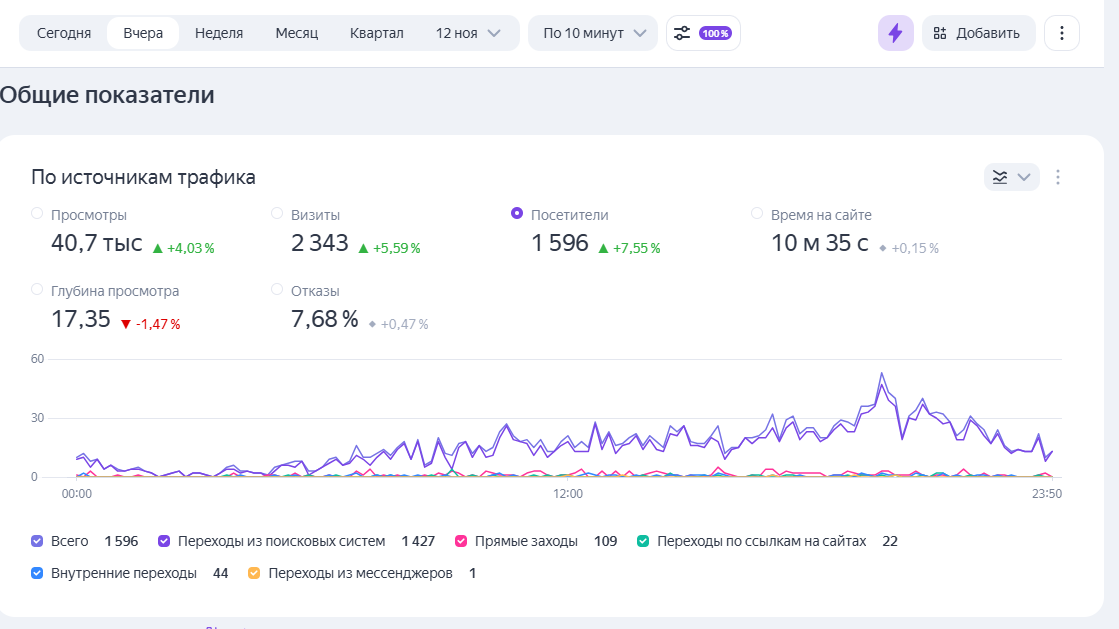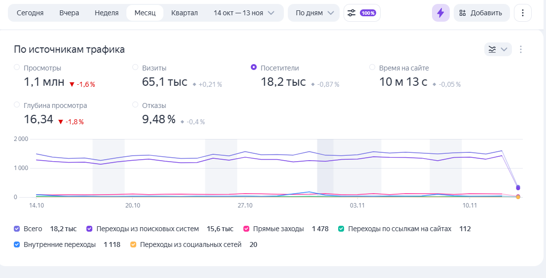 Почти весь трафик — из поисковой выдачи Яндекса, минимум роботов.