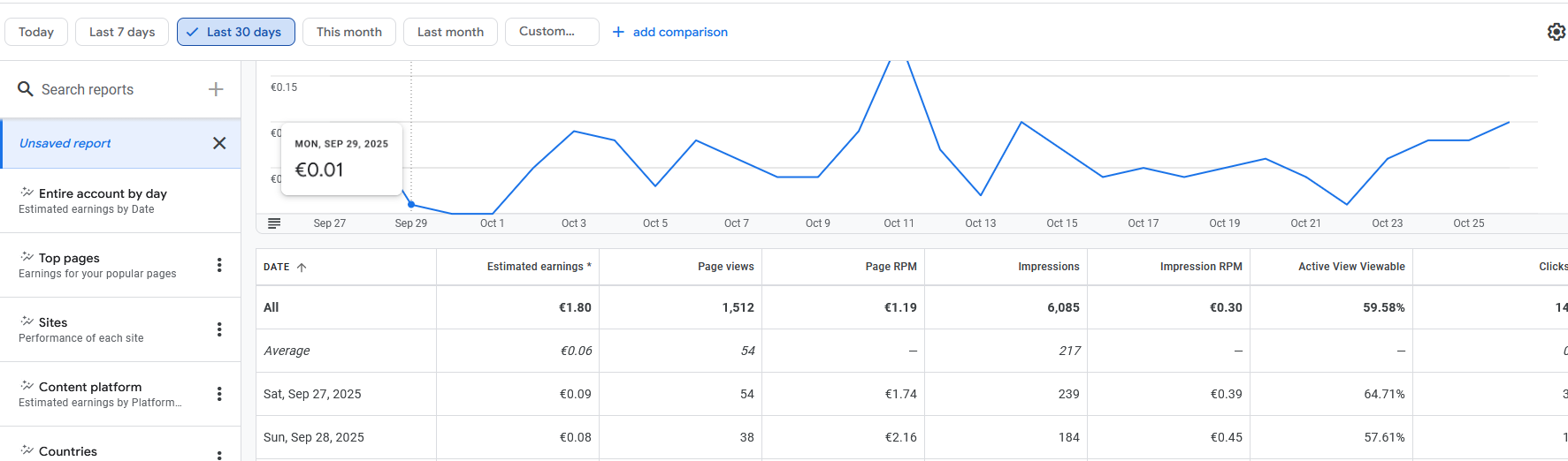 Весь доход с Adsense (скриншот). Указан примерный доход в рублях по курсу 94р за евро. RU версия сайтов никак не монетизируется