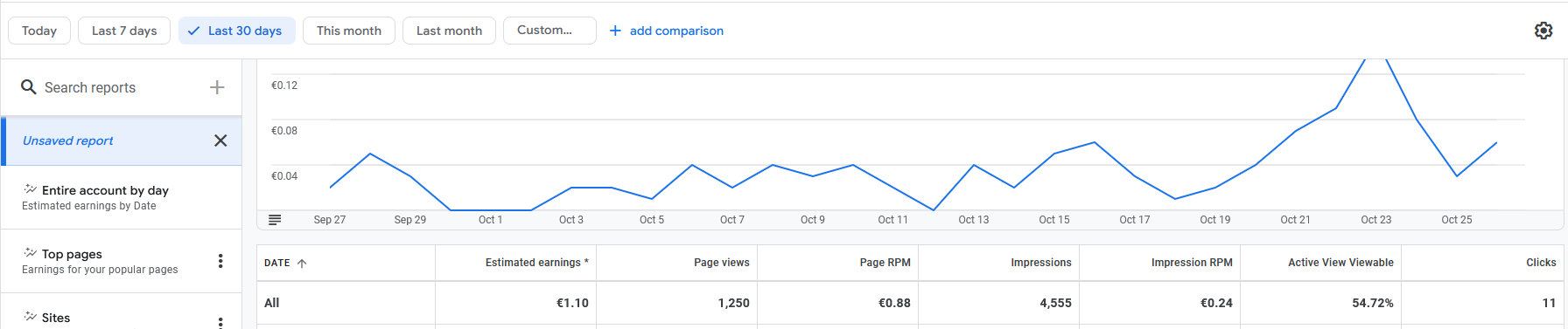 Весь доход с Adsense (скриншот). Указан примерный доход в рублях по курсу 94р за евро. RU версия сайтов никак не монетизируется