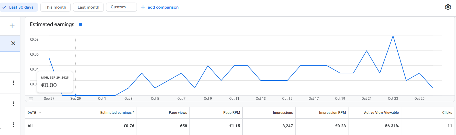 Весь доход с Adsense (скриншот). Указан примерный доход в рублях по курсу 94р за евро. RU версия сайтов никак не монетизируется