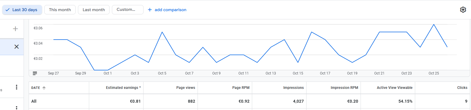 Весь доход с Adsense (скриншот). Указан примерный доход в рублях по курсу 94р за евро. RU версия сайтов никак не монетизируется