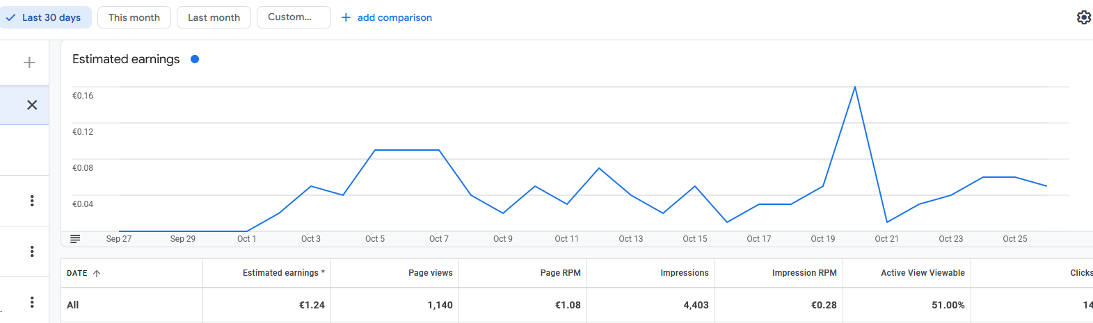 Весь доход с Adsense (скриншот). Указан примерный доход в рублях по курсу 94р за евро. RU версия сайтов никак не монетизируется