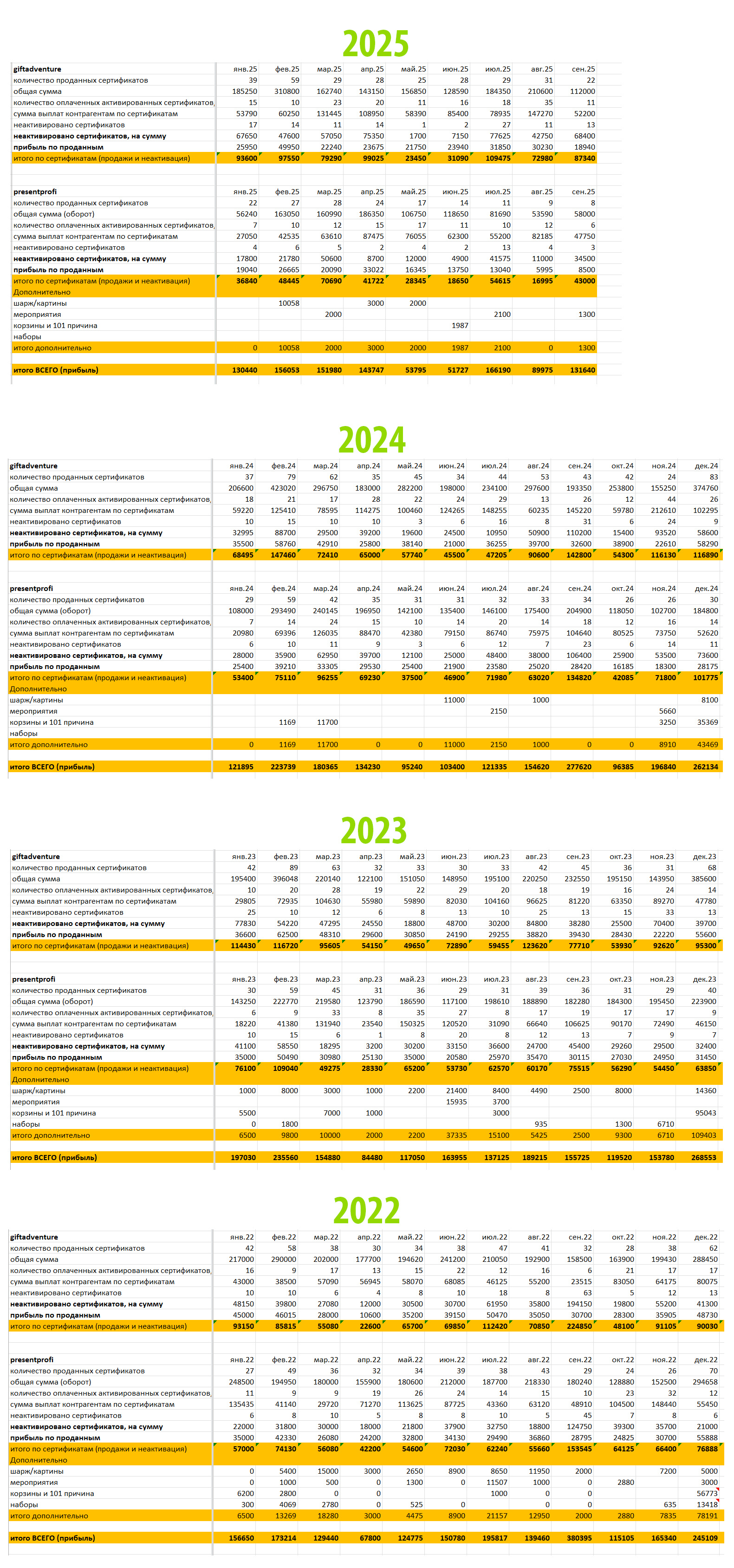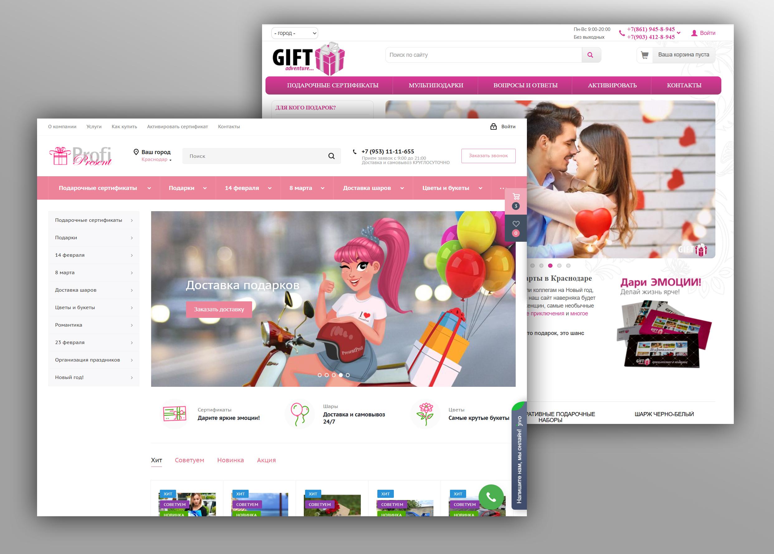 Сайты PRESENTPROFI.RU и GIFTADVENTURE.RU, специализируются на продаже оригинальных подарков, сувениров и подарочных сертификатов в Краснодаре. Основная тематика связана с подбором подарков к различным праздникам и событиям — Новый год, день рождения, 14 февраля, 23 февраля, 8 марта и другие. Кроме подарочных сертификатов, на сайтах можно найти разнообразные товары, включая игрушки, кондитерские изделия и цветы.