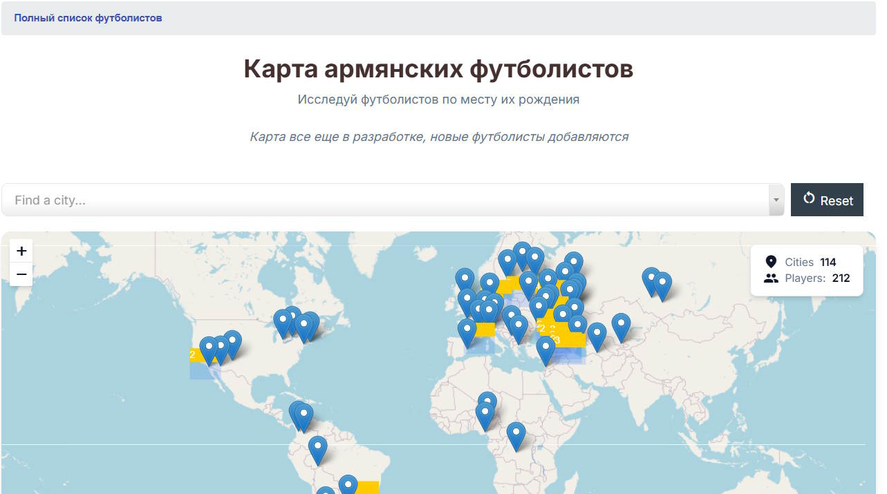 На сайте есть уникальная карта футболистов, можно создавать профилиспортсменов со статистикой.Карту можно адаптировать под любой вид спорта и для других сран.