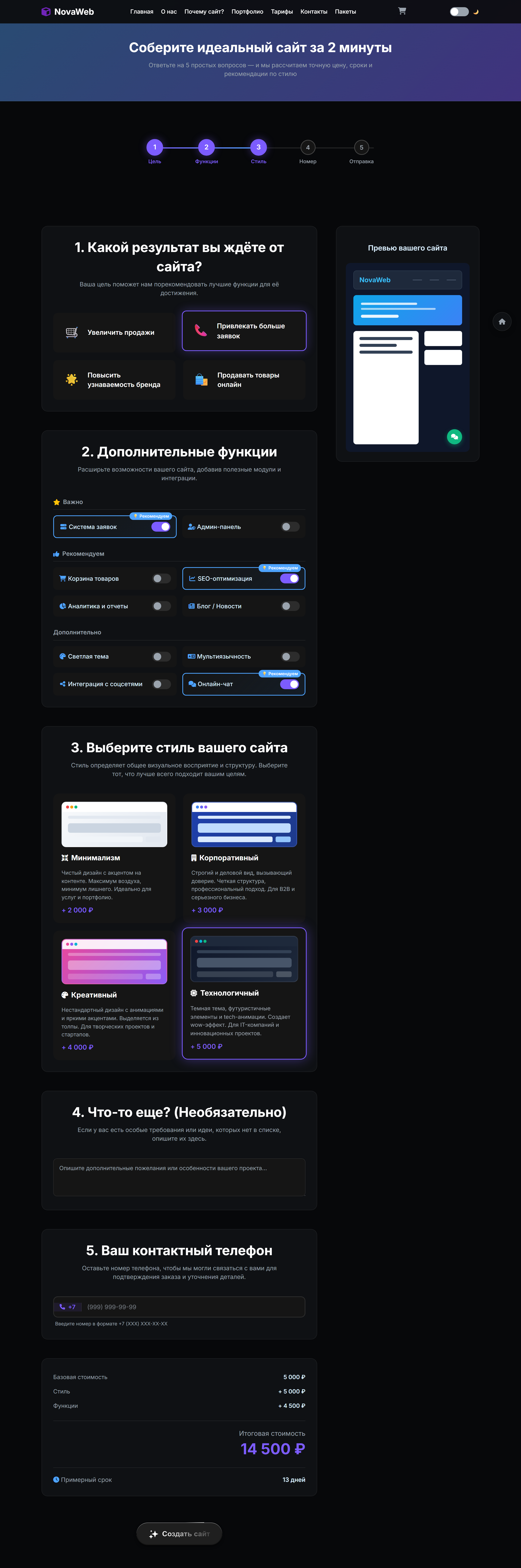 Интерактивный конструктор сайтов: Клиент сам собирает сайт из опций, видит итоговую стоимость и отправляет вам уже "прогретую" заявку. Это отличный генератор лидов!