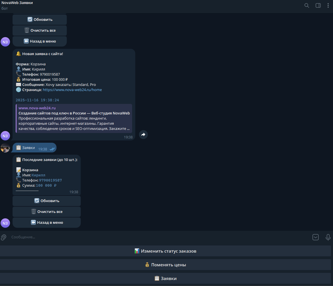 Просмотр заявок: Все заявки с сайта (из корзины, конструктора, форм) мгновенно приходят в бота и хранятся в отдельном разделе.