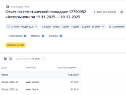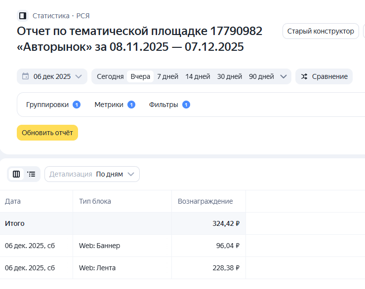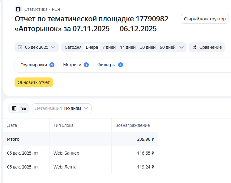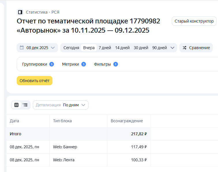 Сайт добавлен в РСЯ 21.11.25г Ежедневный средний доход от РСЯ 200-300р. Доход от РСЯ за период 21.11 - 9.12.25 4 087,50 ₽