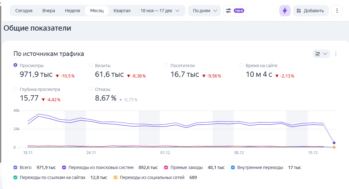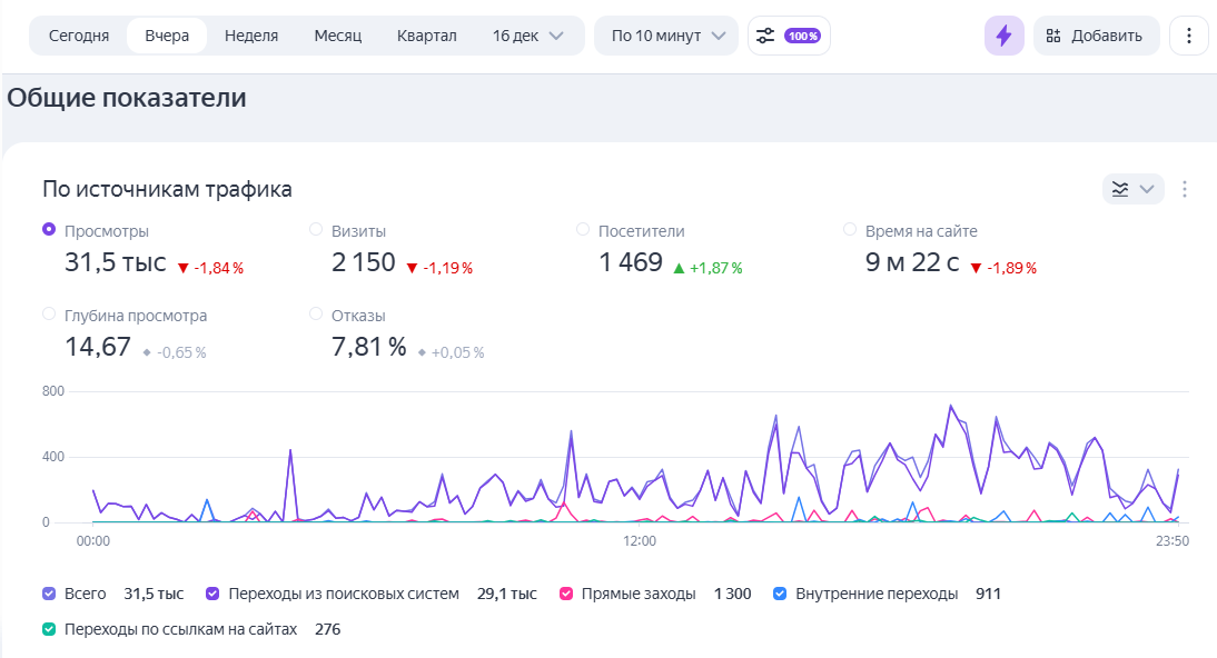 Почти весь трафик — из поисковой выдачи Яндекса, минимум роботов.