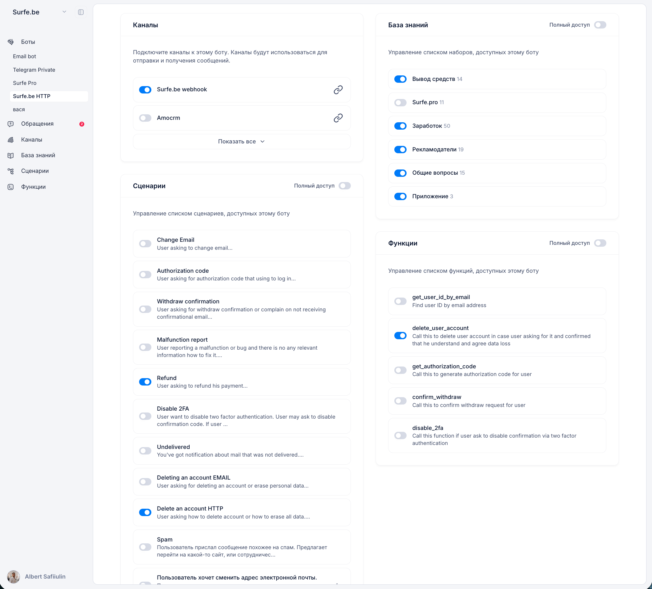 Готовая основа для запуска собственного сервиса чат-ботов. Добавьте биллинг, настройте маркетинг — и можно принимать клиентов. Аналогичные SaaS-решения (Wikibot, Tidio) берут от 5,000₽ до 50,000₽ в месяц с клиента.