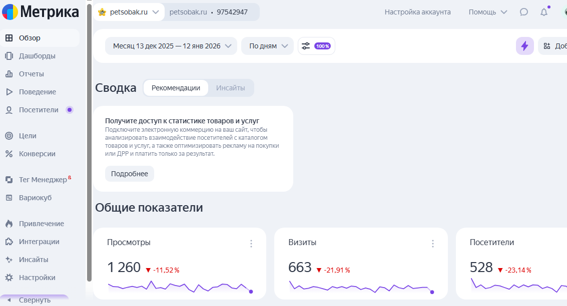 Трафик (13.12.2025 — 12.01.2026): 663 визита, 1260 просмотров, 528 посетителей.