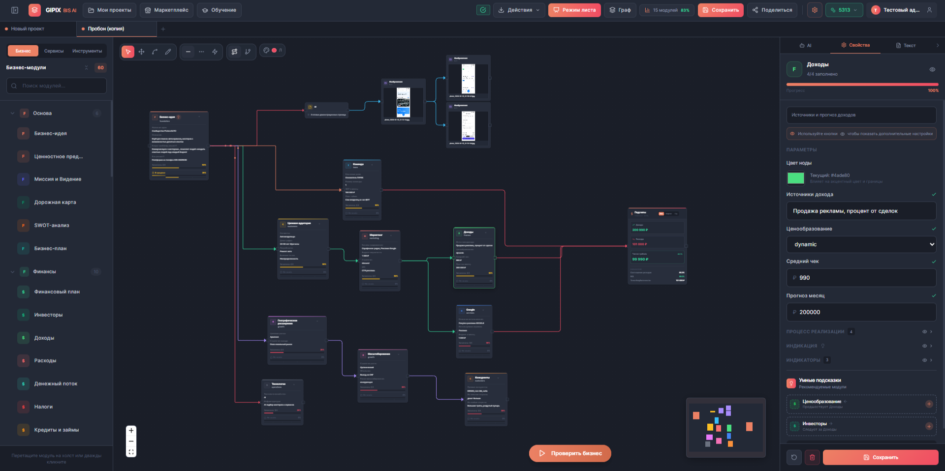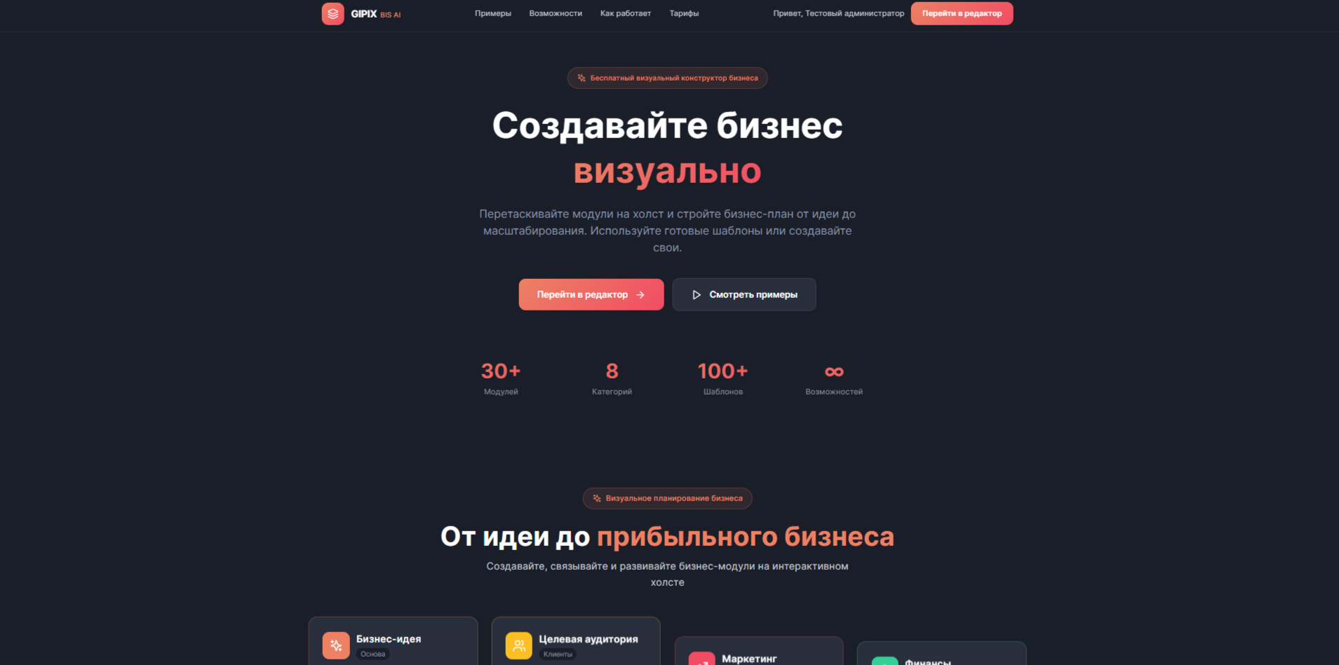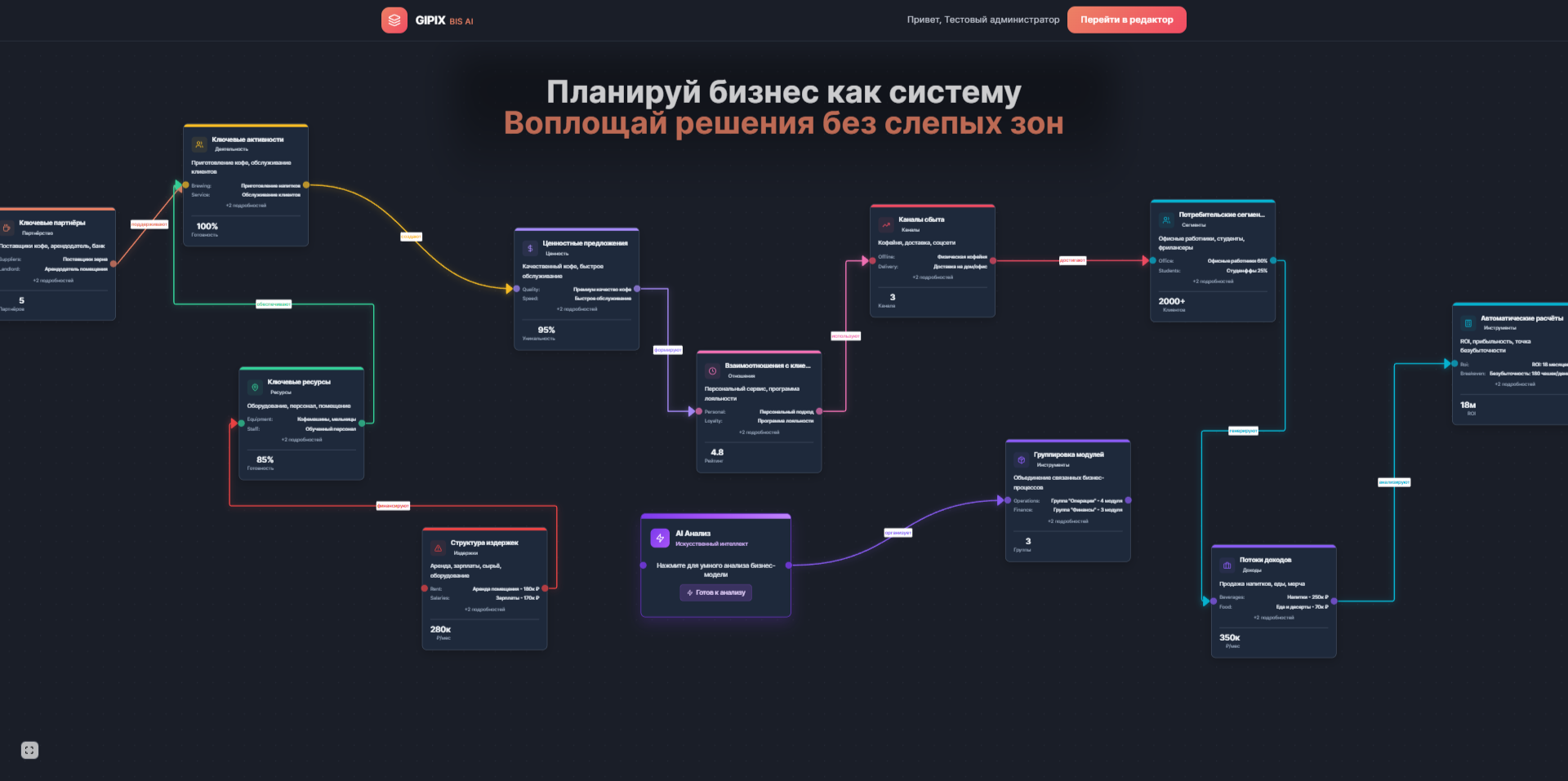 **GIPIX BIS AI** — это B2B SaaS платформа для визуального проектирования бизнеса с интеграцией AI-ассистента. Платформа позволяет предпринимателям, консультантам и инвесторам создавать, анализировать и презентовать бизнес-модели через интуитивный drag-and-drop интерфейс на бесконечном холсте.