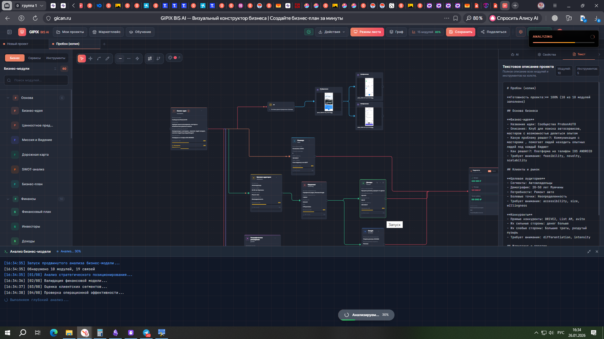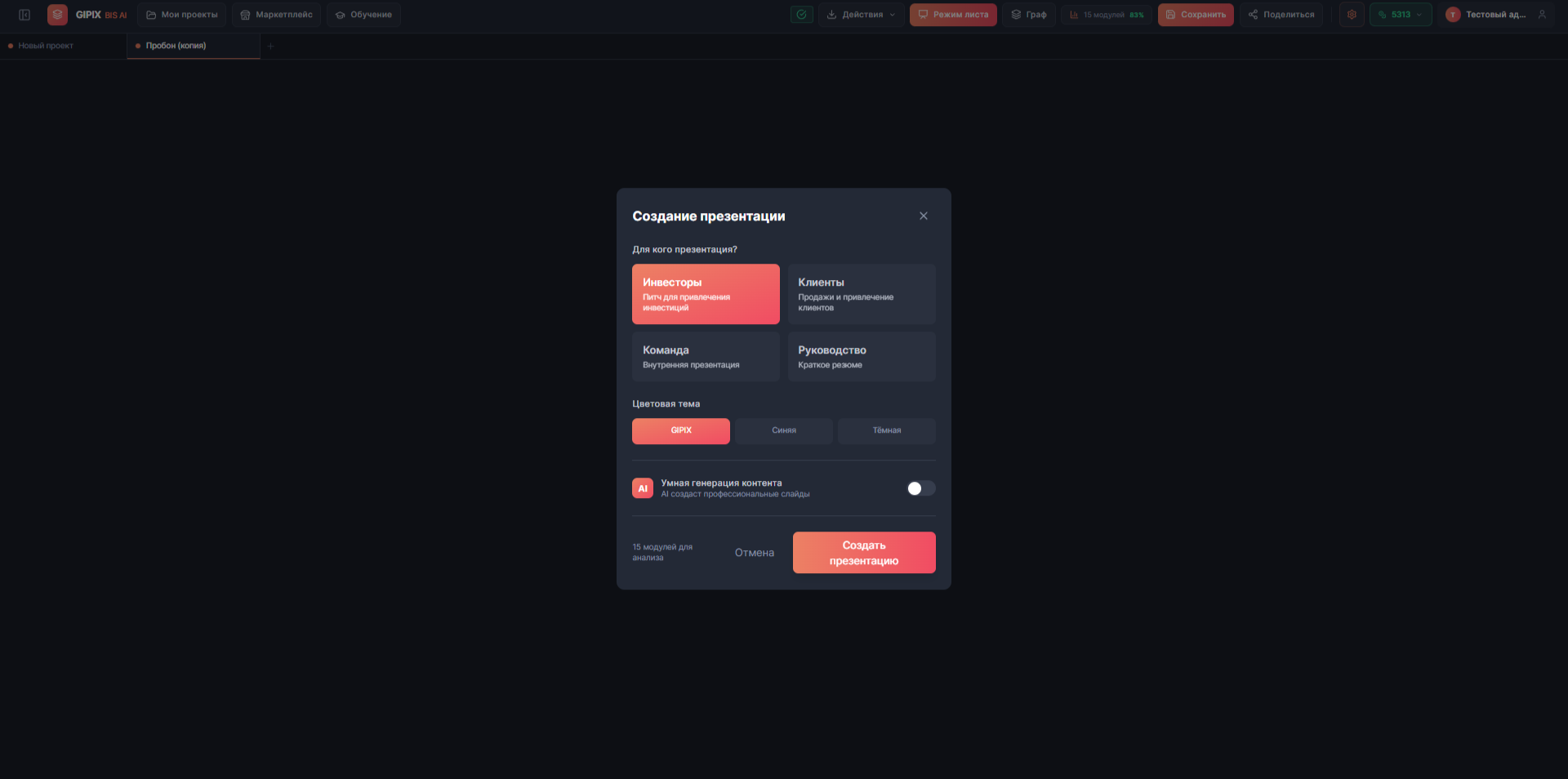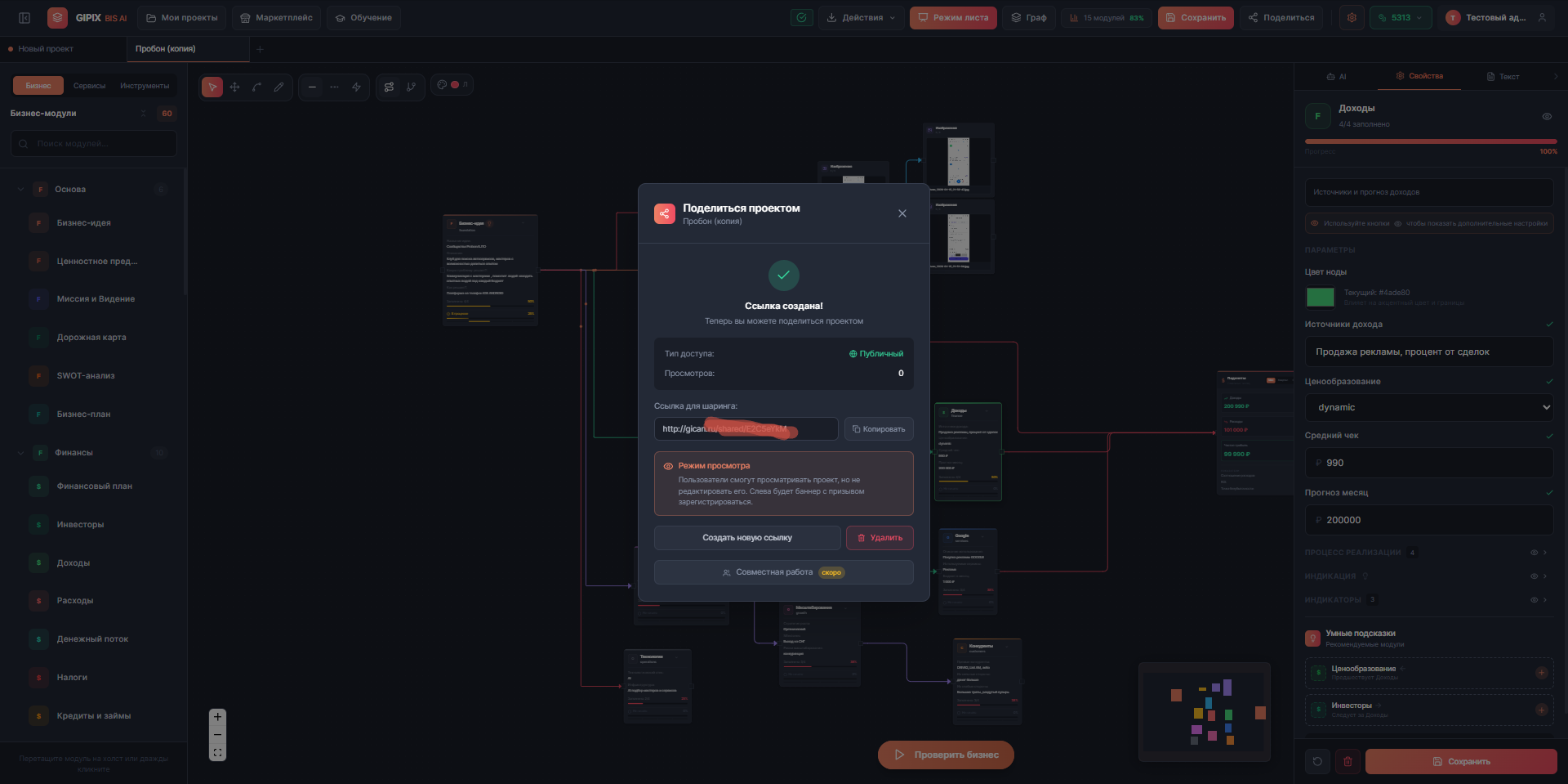 **GIPIX BIS AI** — это B2B SaaS платформа для визуального проектирования бизнеса с интеграцией AI-ассистента. Платформа позволяет предпринимателям, консультантам и инвесторам создавать, анализировать и презентовать бизнес-модели через интуитивный drag-and-drop интерфейс на бесконечном холсте.