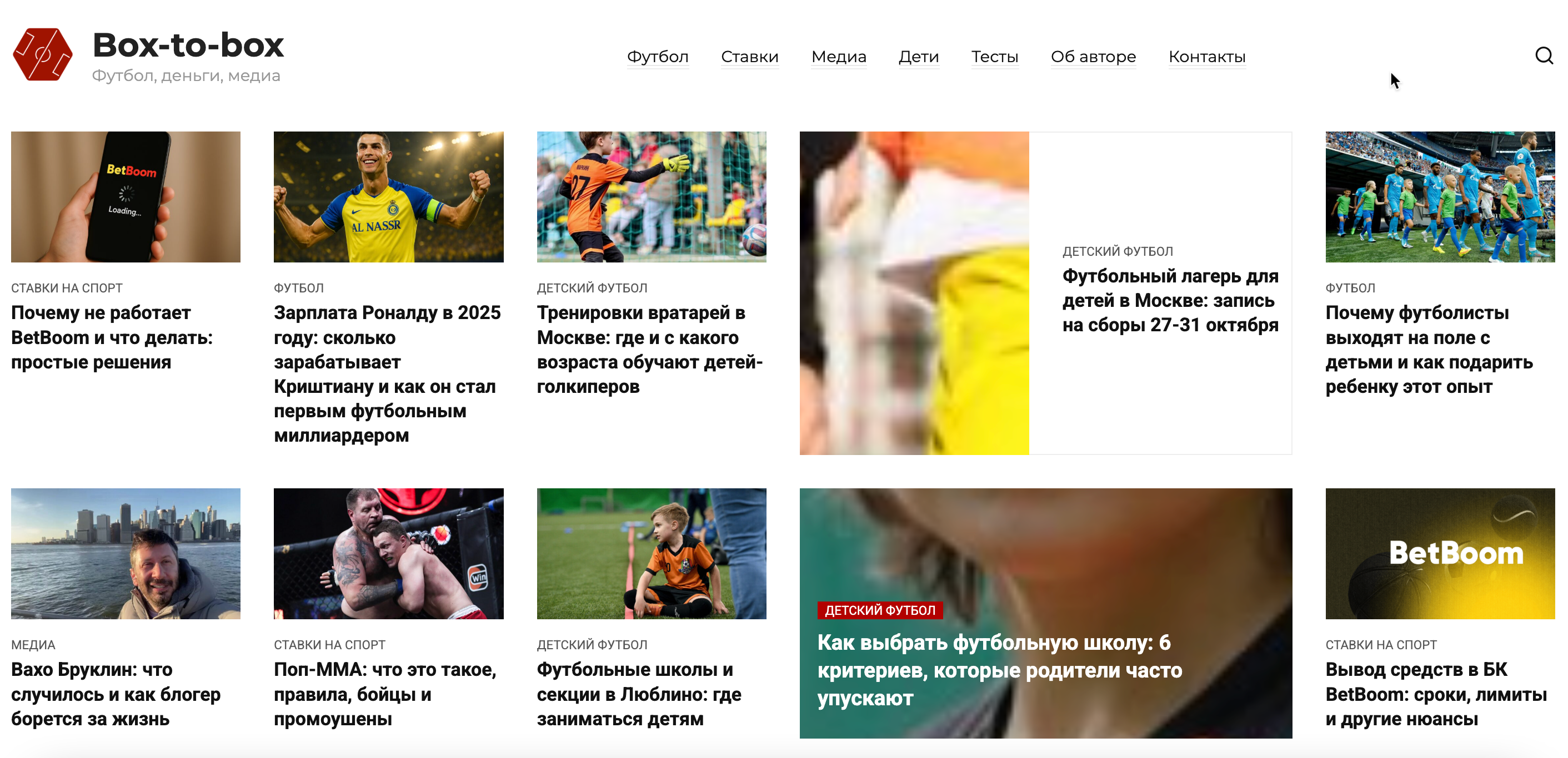 Проект создан как контентная платформа под монетизацию в нише беттинга и футбольной аналитики. На сайте публикуются статьи о букмекерских конторах, рейтинги БК, обзоры бонусов, а также футбольные материалы (АПЛ, РПЛ, еврокубки, игроки, зарплаты, аналитика).