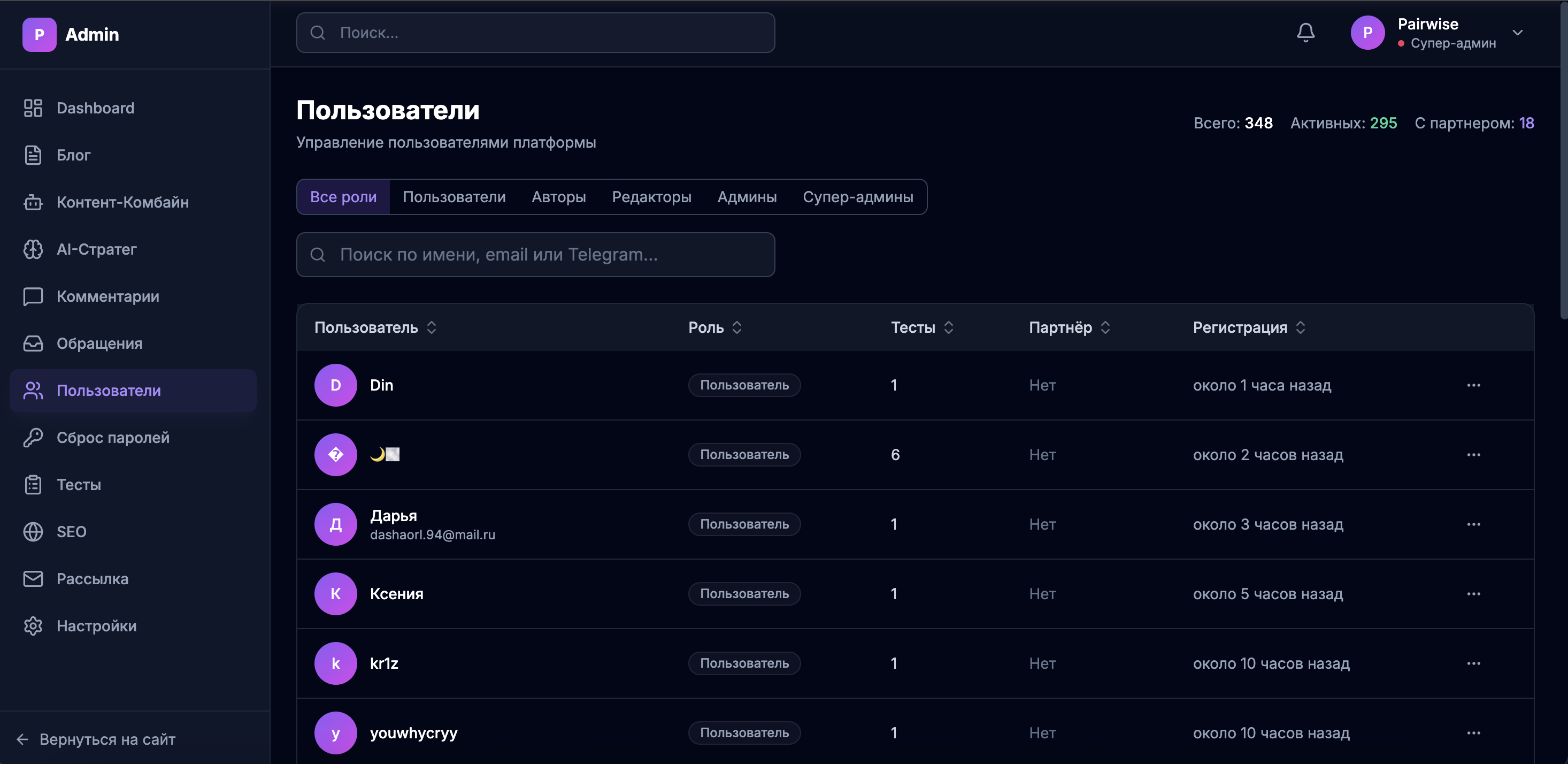 - Управление пользователями и ролями (USER → ADMIN → SUPER_ADMIN)