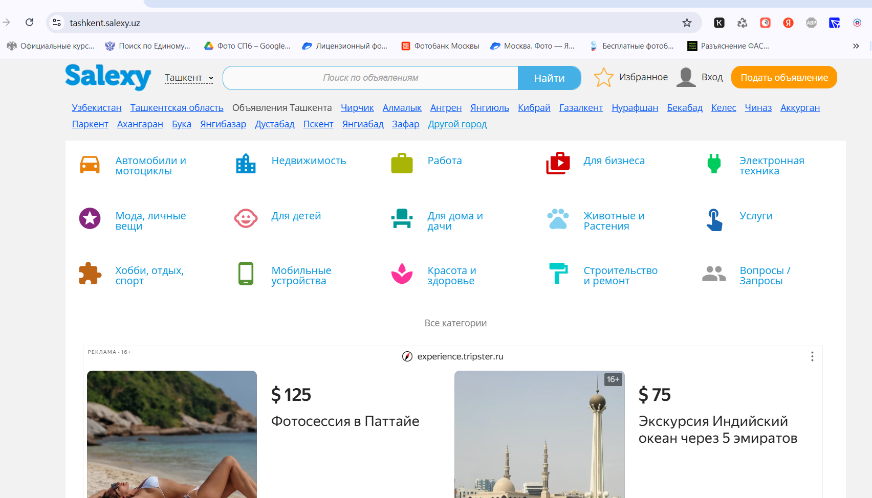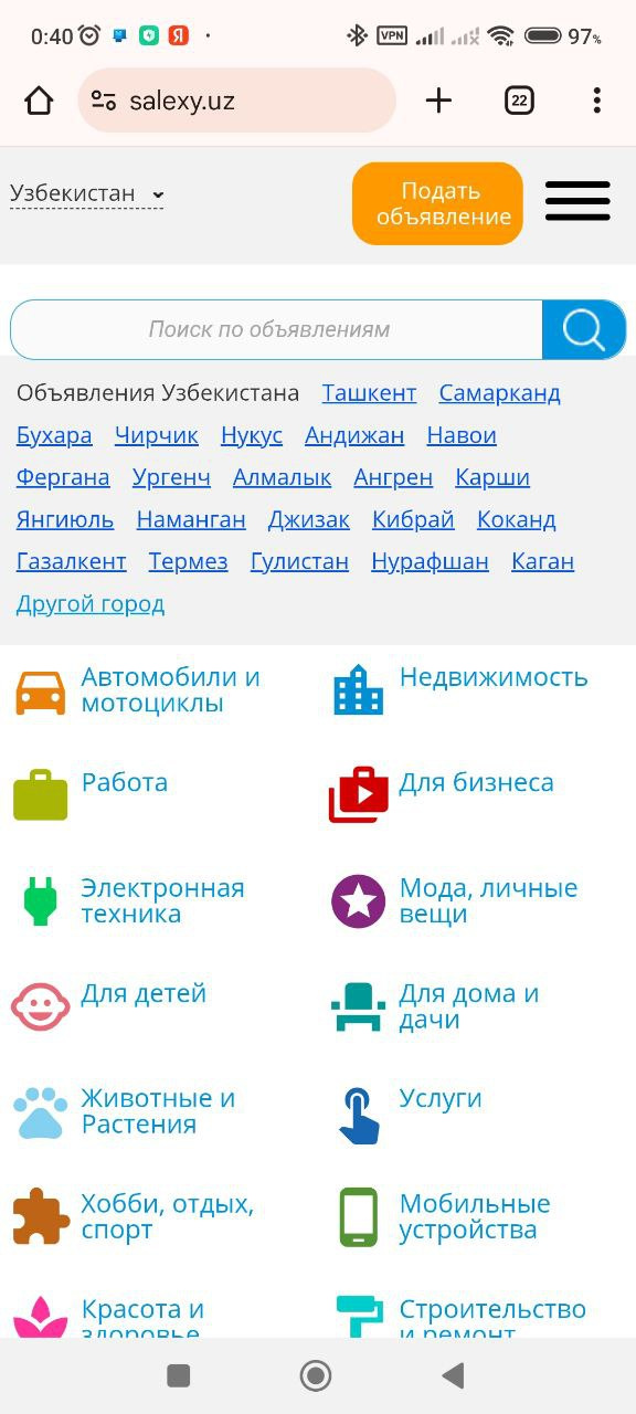 Разноплановая площадка для размещения объявлений о покупке и продаже автомобилей, квартир, вещей, для предложения услуг, а также для найма работников или поиска работы. Платформа, которую ежемесячно посещает порядка 20 тыс. посетителей из Узбекистана. Каждый из 125 населенных пунктов, представленных на сайте, имеет отдельный поддомен.