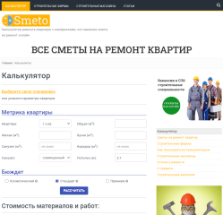 Сайт представляет собой независимый онлайн-калькулятор расчета стоимости ремонта квартир, ориентированный на составление готовых смет по отделке в Санкт-Петербурге, с учетом актуальных цен на работы и материалы для новостроек и вторичного жилья. Сервис позволяет бесплатно, без регистрации, смс или указания контактных данных, рассчитать смету в три этапа: выбрать тип ремонта (косметический, стандартный или премиум), уточнить материалы для пола, стен и потолка в разных помещениях с подсказками по их характеристикам, а также добавить необходимые товары для проживания, что обеспечивает точную и открытую оценку затрат на основе мониторинга рынка строительных услуг и материалов в СПб[1][3].