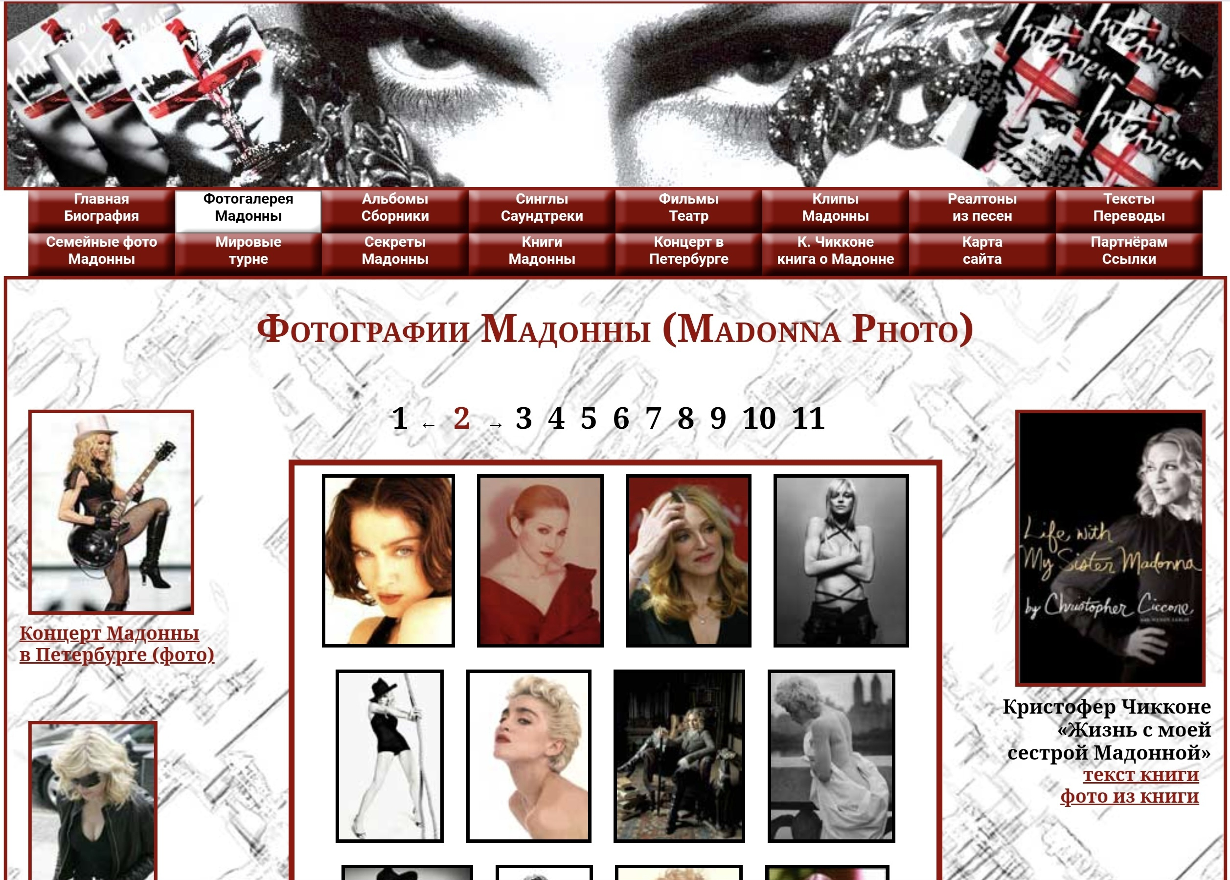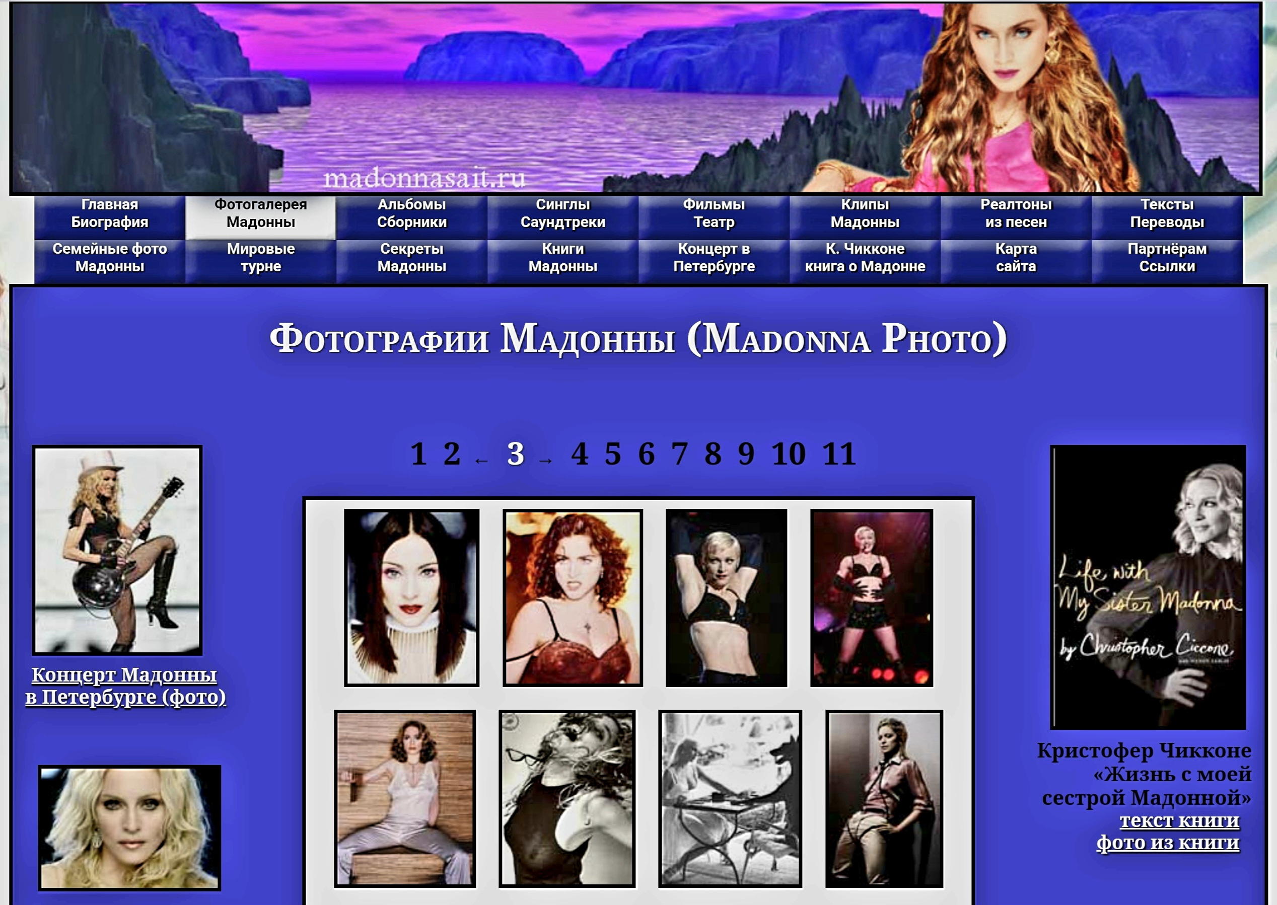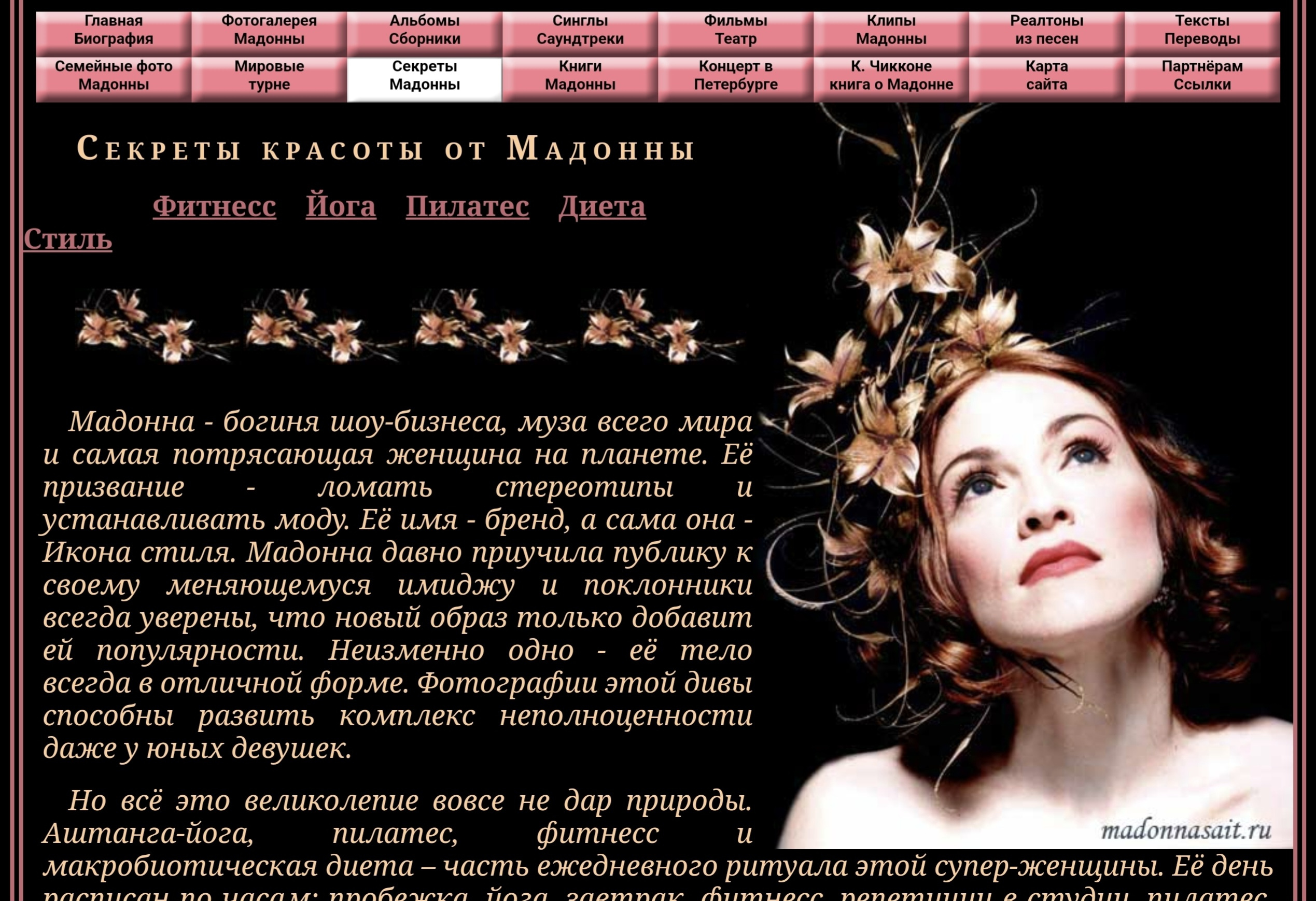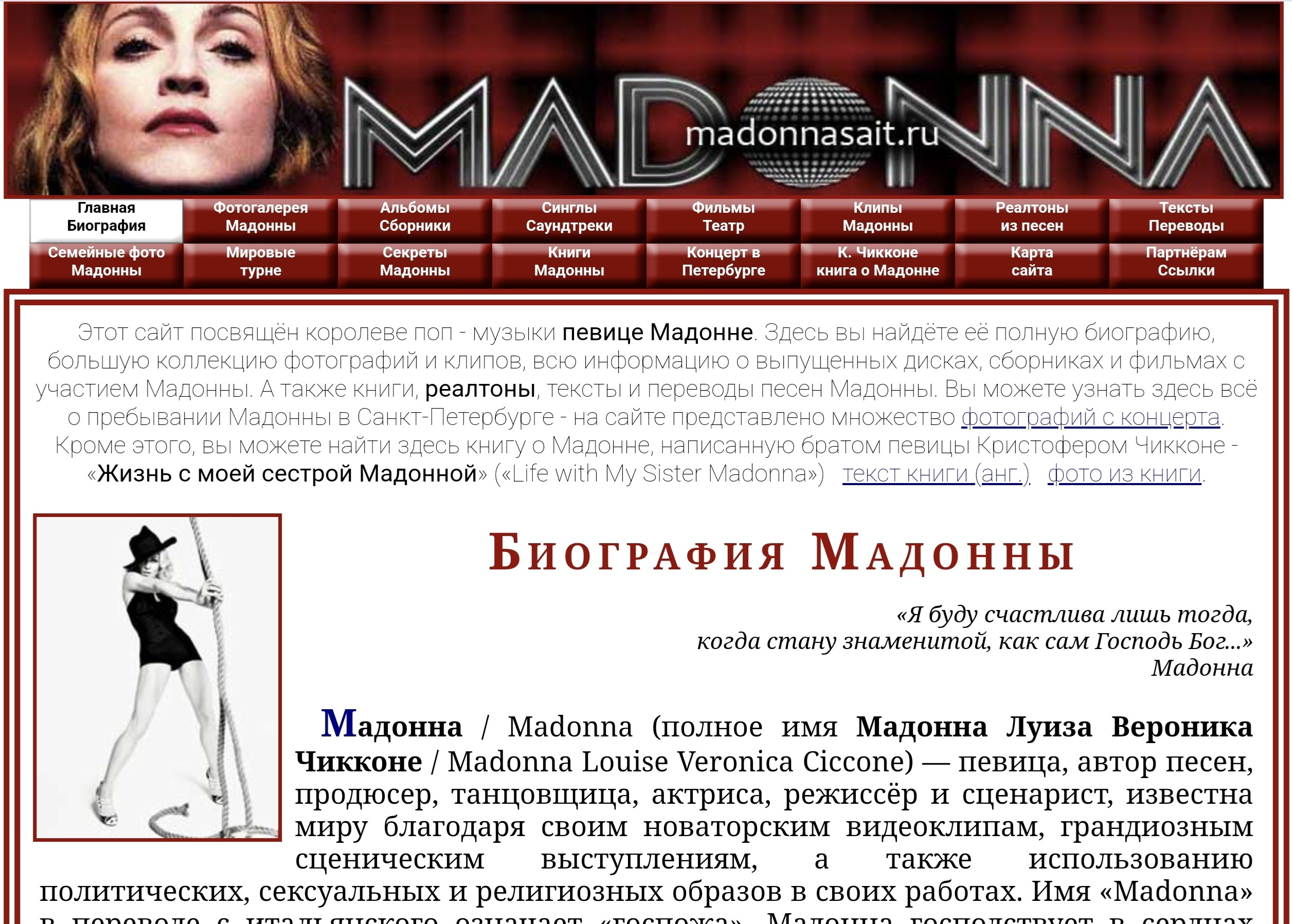 Сайт посвящён королеве поп - музыки, американской певице Мадонне. На ресурсе размещена подробная биография певицы, огромная коллекция фотографий, в том числе, редкие семейные фото Мадонны. Имеется вся информация о выпущенных дисках, клипах, сборниках и фильмах с участием Мадонны до 2012 года. А также книги, тексты и переводы песен певицы.