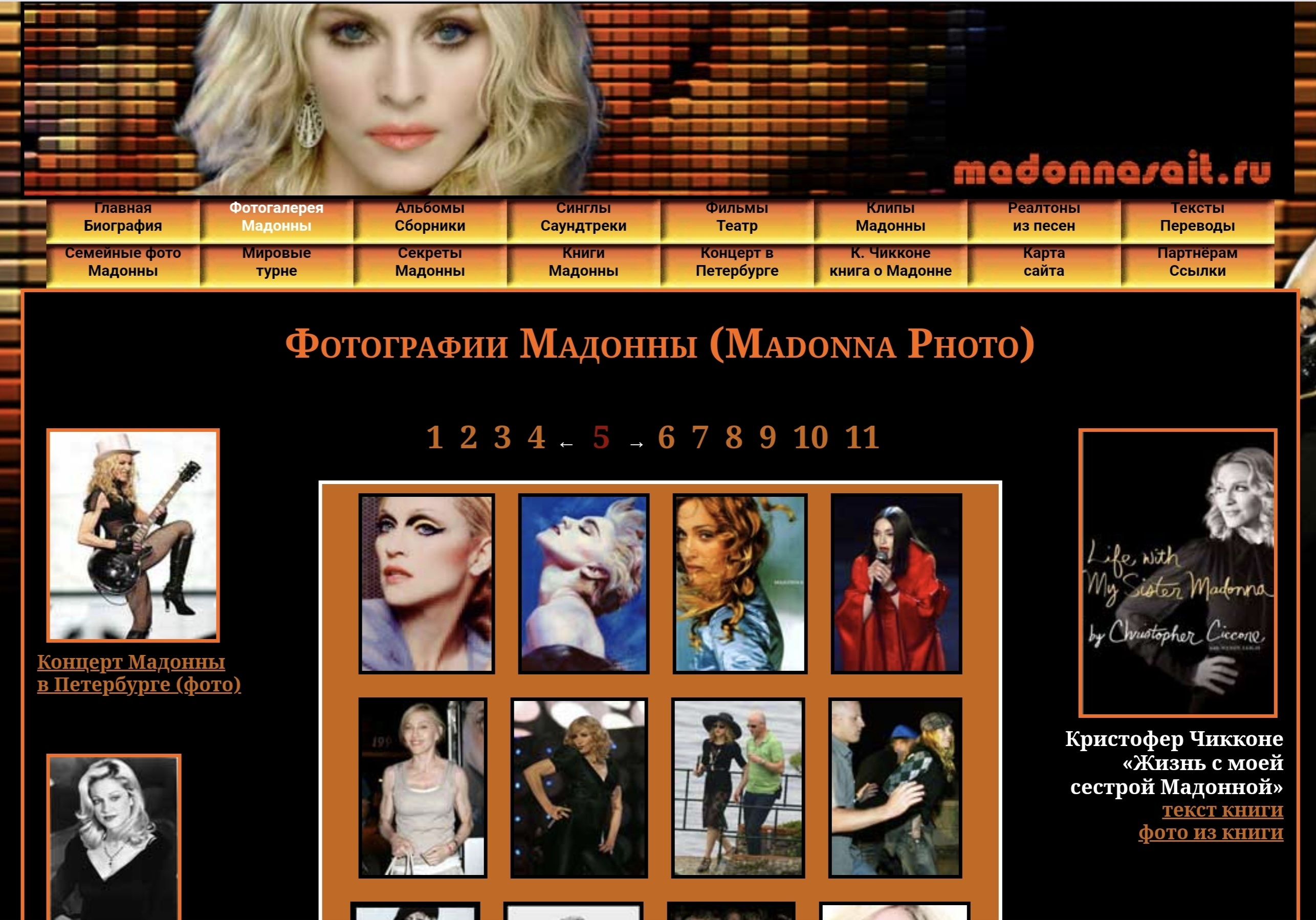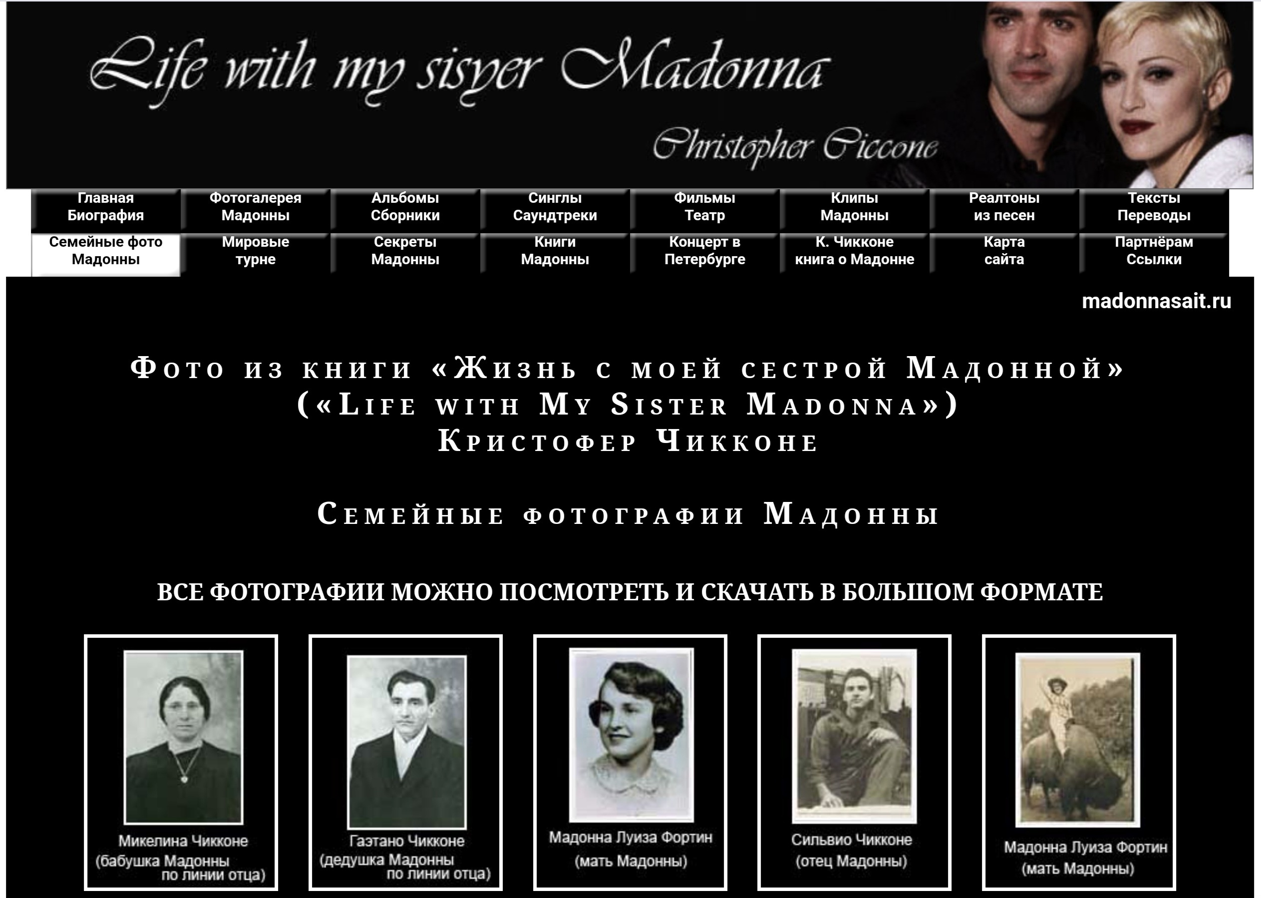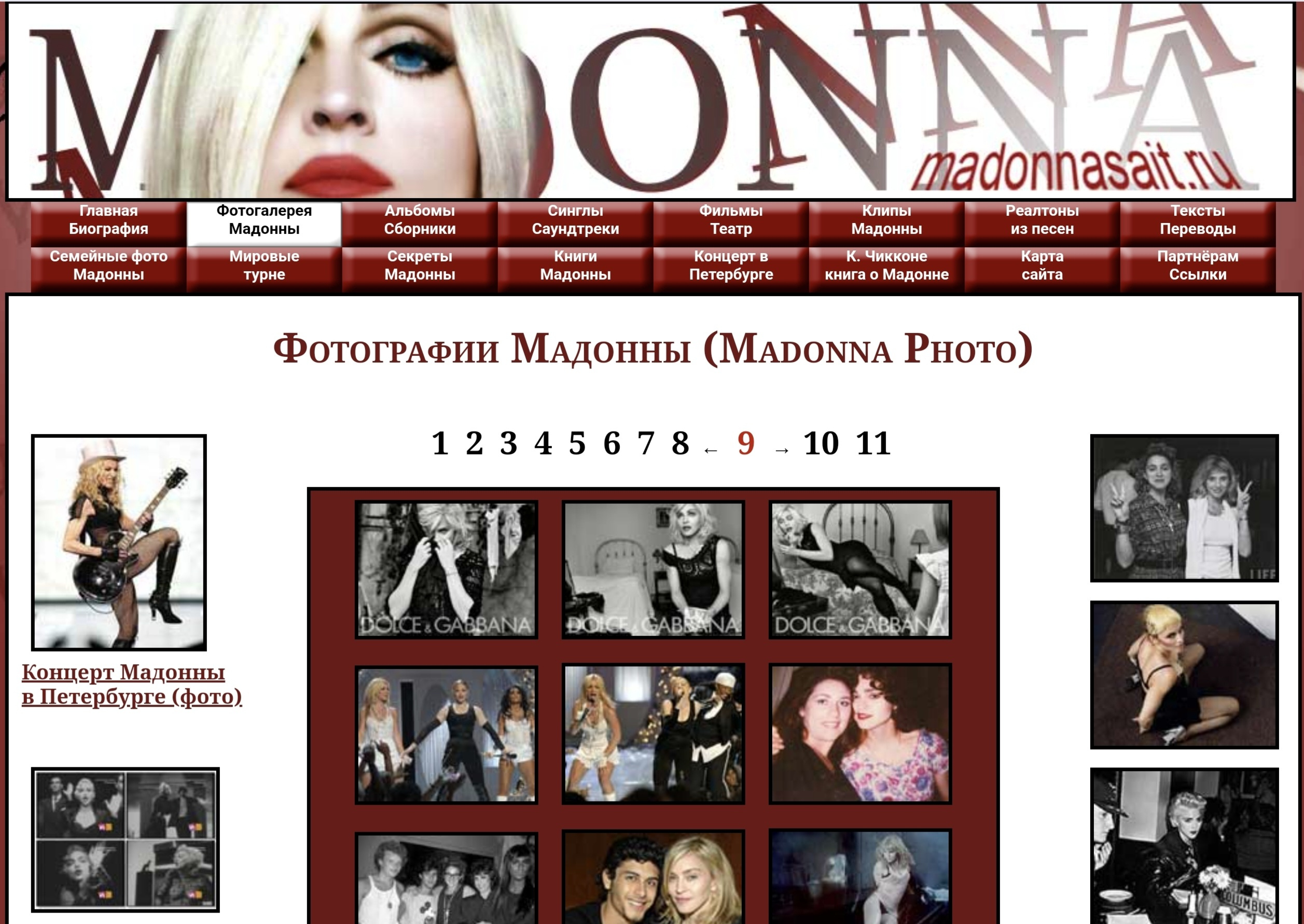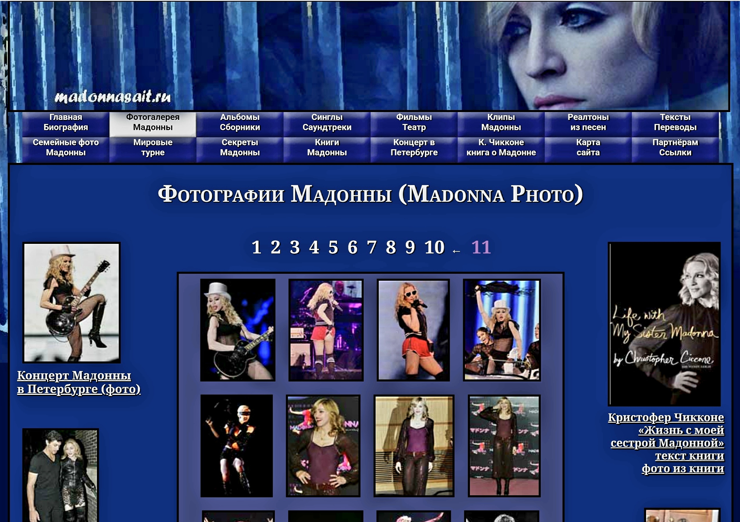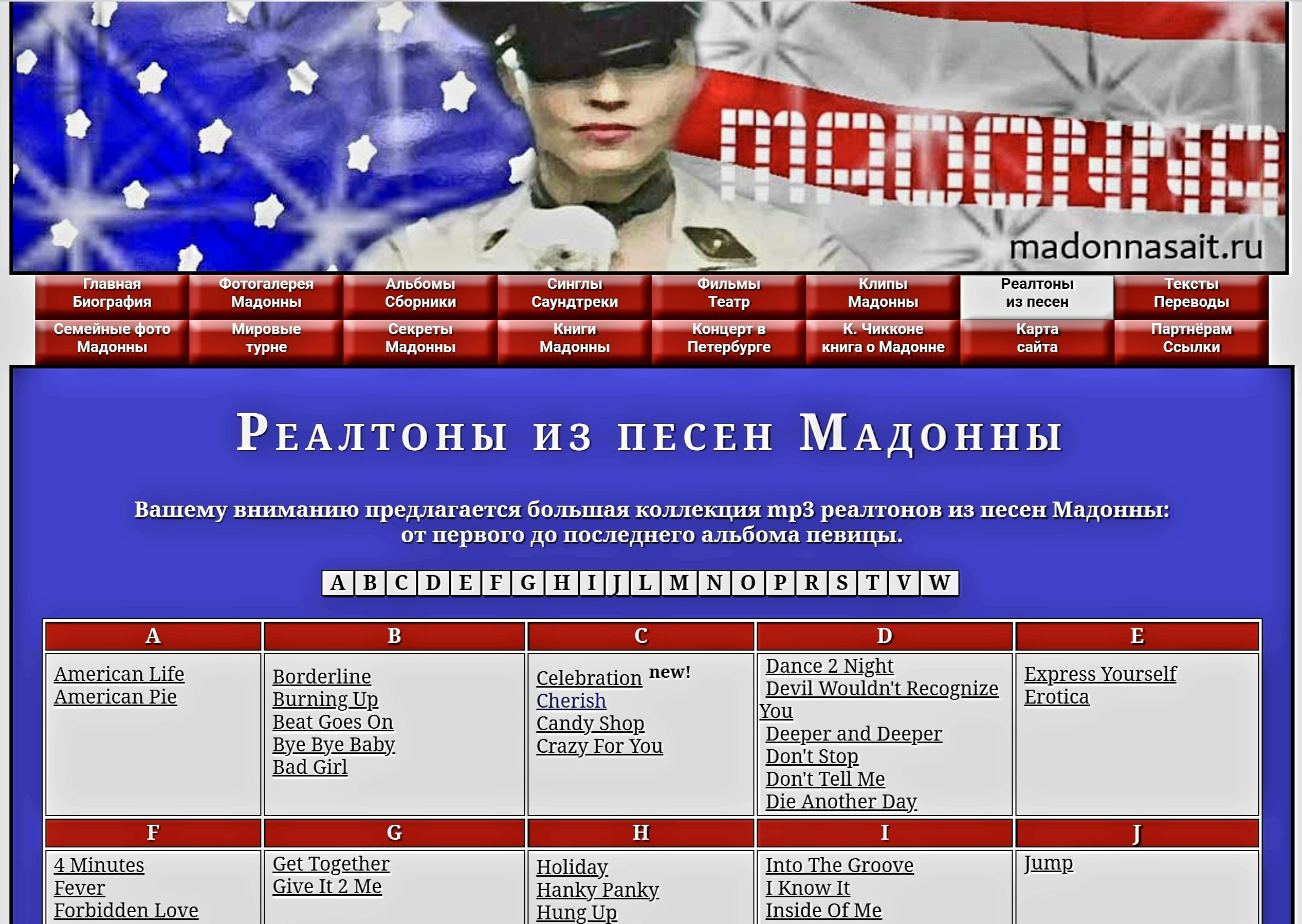 Сайт посвящён королеве поп - музыки, американской певице Мадонне. На ресурсе размещена подробная биография певицы, огромная коллекция фотографий, в том числе, редкие семейные фото Мадонны. Имеется вся информация о выпущенных дисках, клипах, сборниках и фильмах с участием Мадонны до 2012 года. А также книги, тексты и переводы песен певицы.
