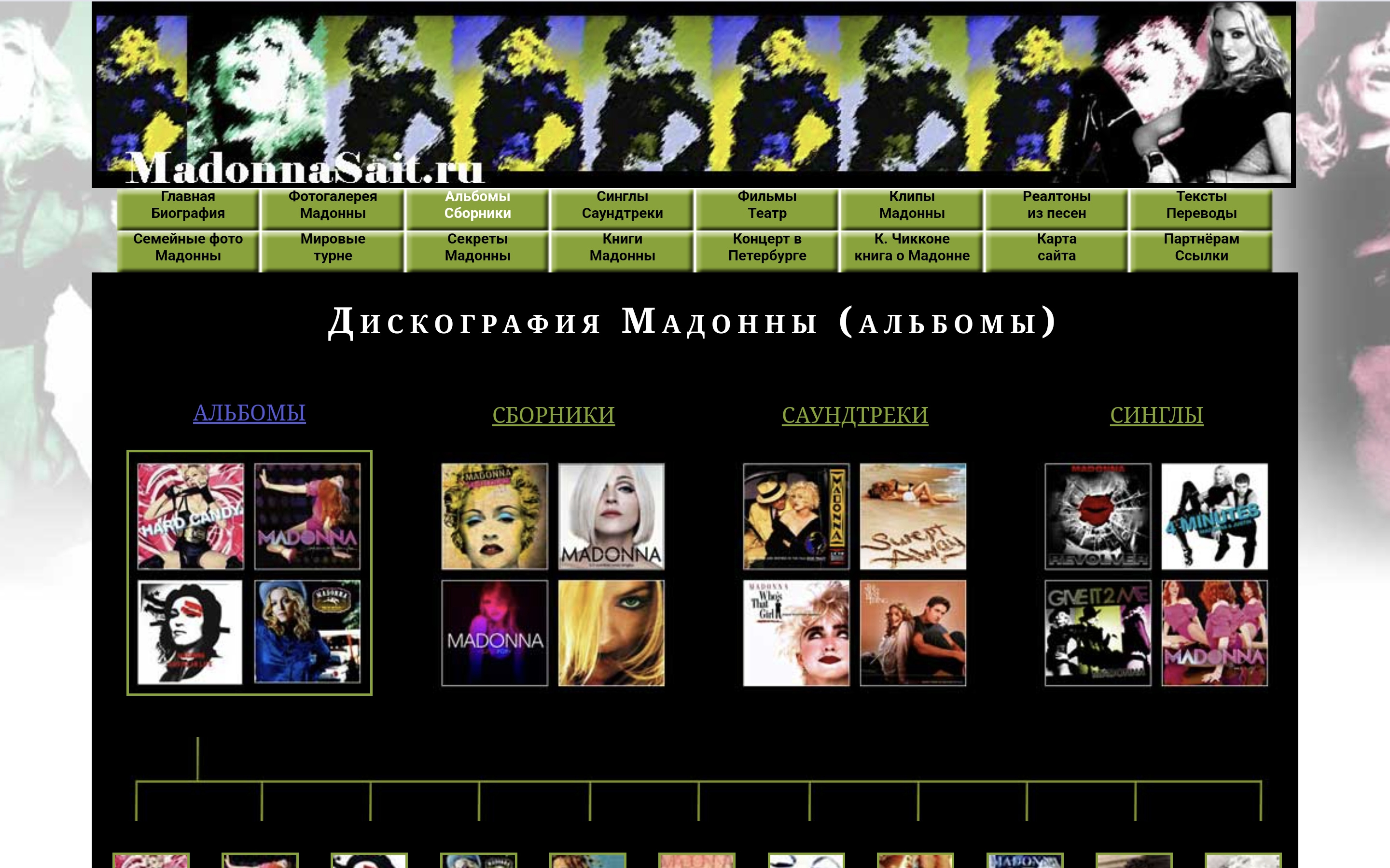6. Вся информация о выпущенных альбомах, сборниках, синглах, саундтреках, а также клипы, книги и фильмы с участием Мадонны (до 2012 года).