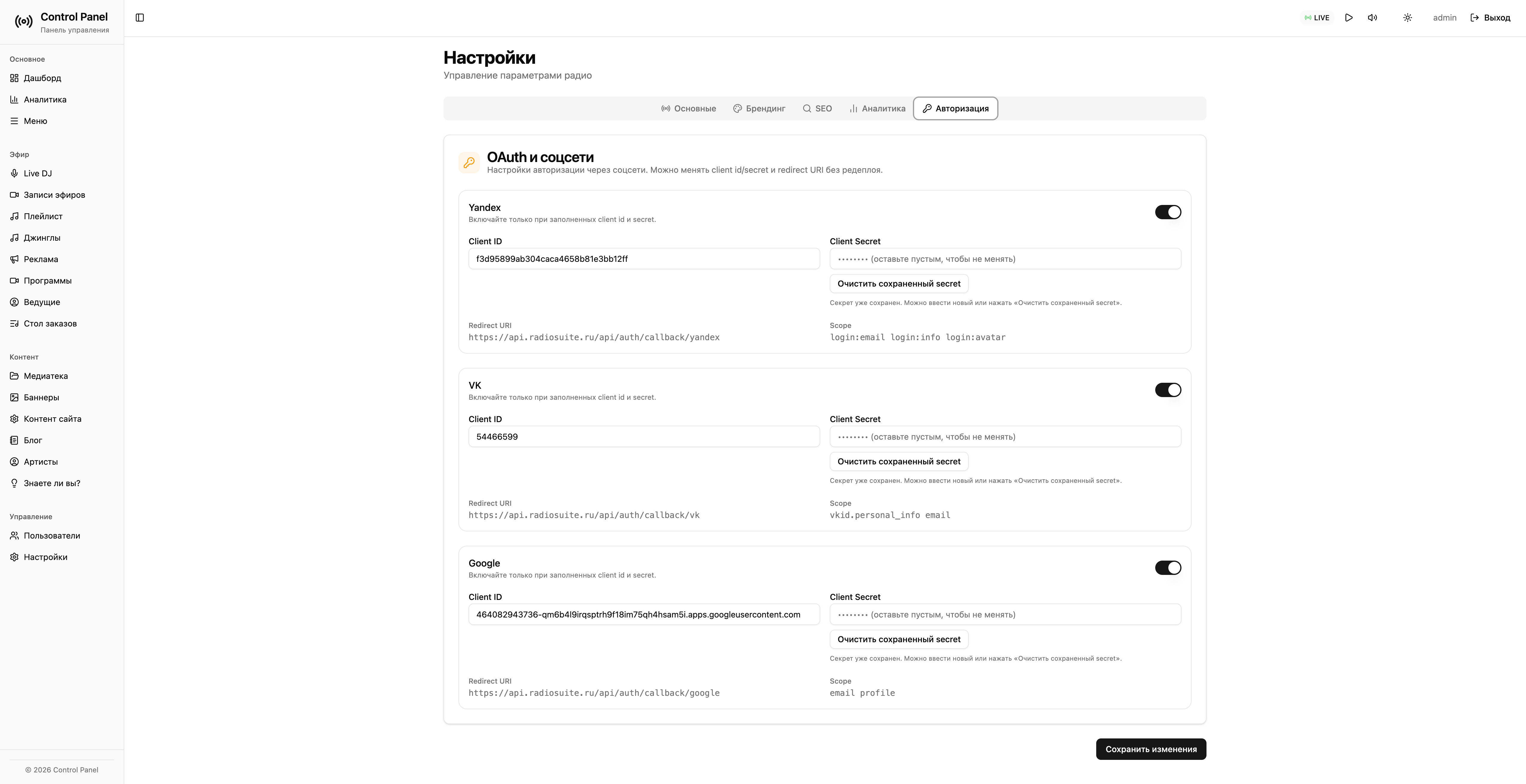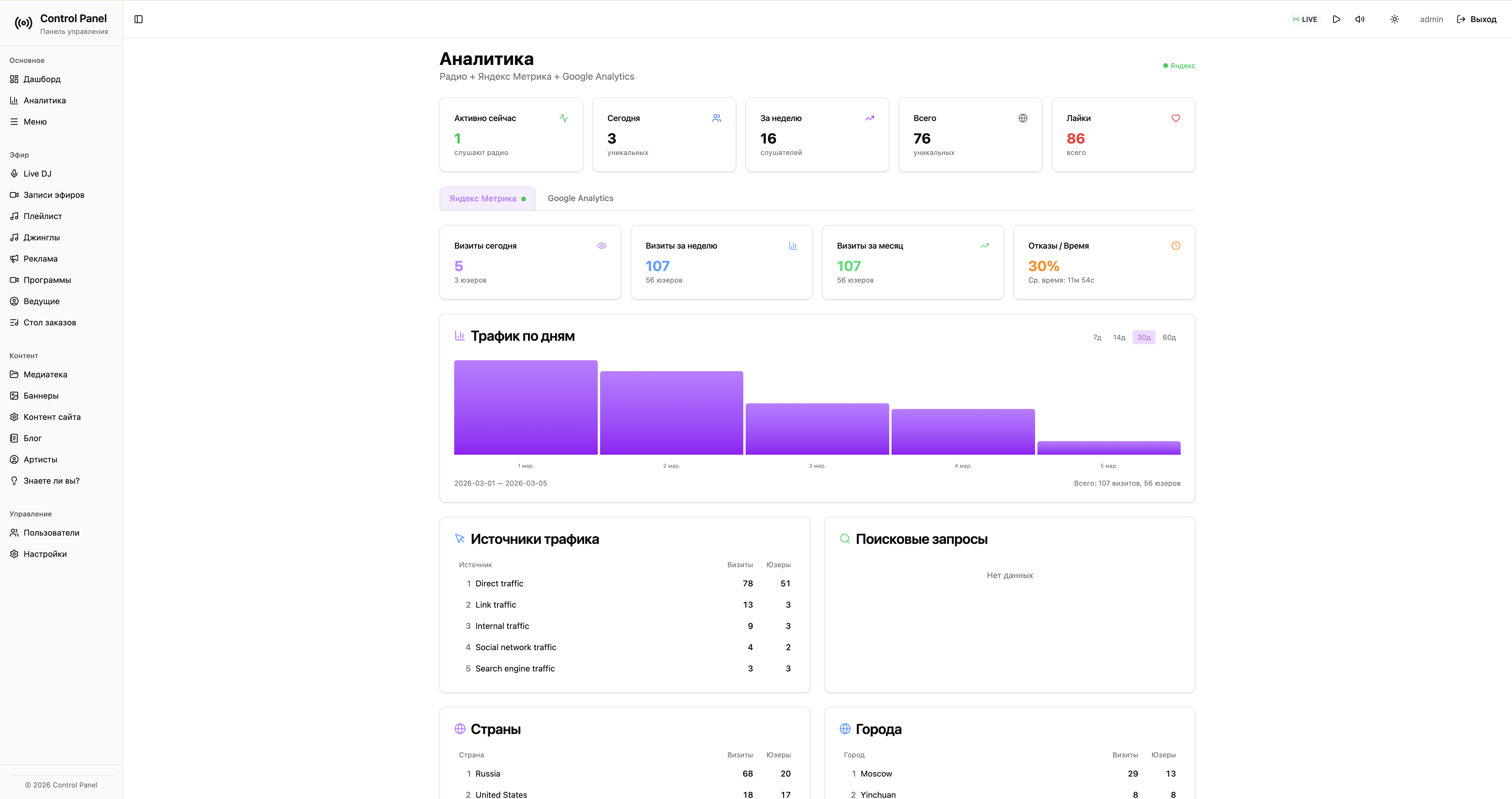 Встроенная аналитика (онлайн‑слушатели, история, лайки, активность).