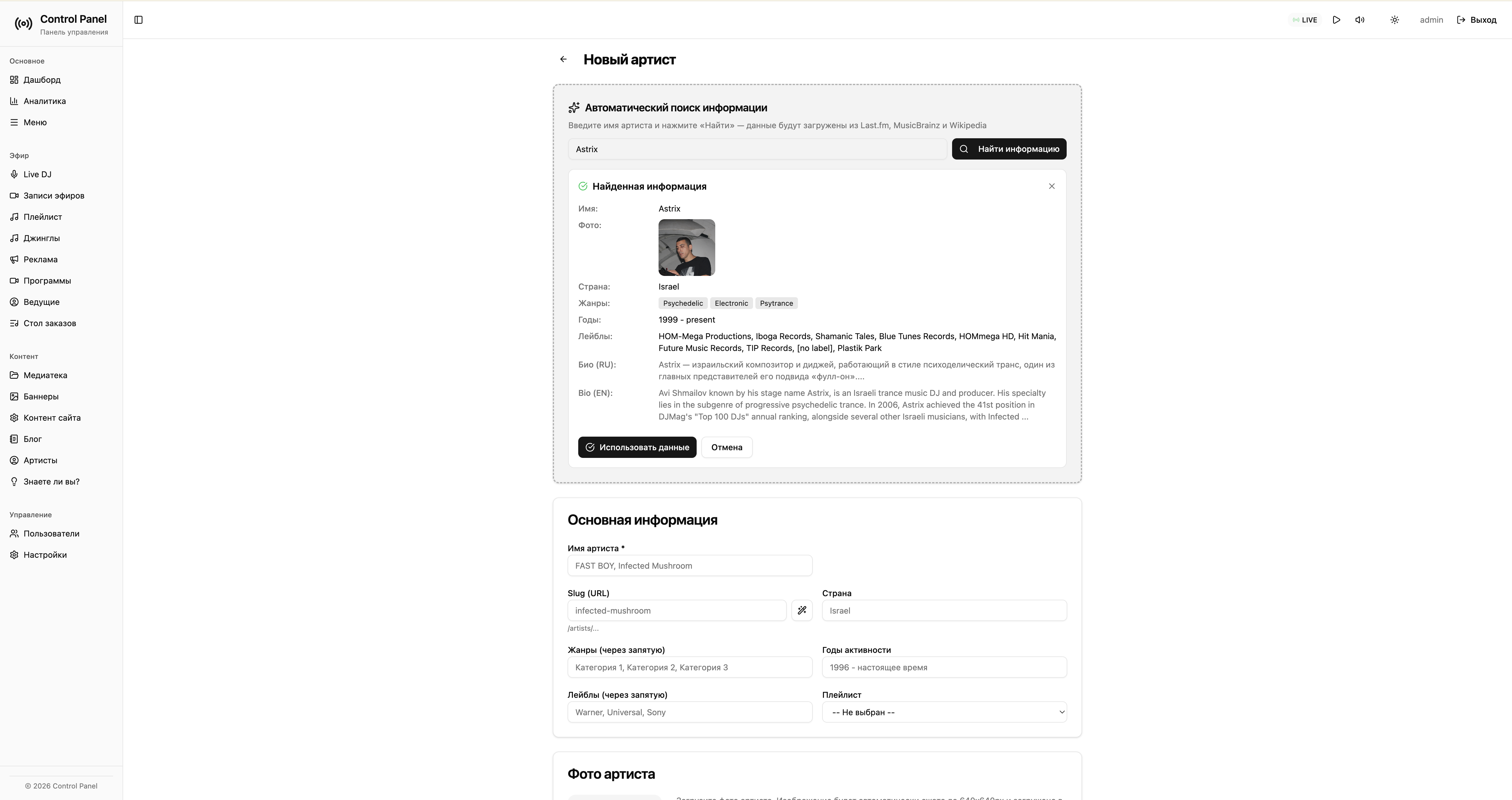 Актуальный контент: плейлисты, программы, блог, артисты, оформленные страницы.