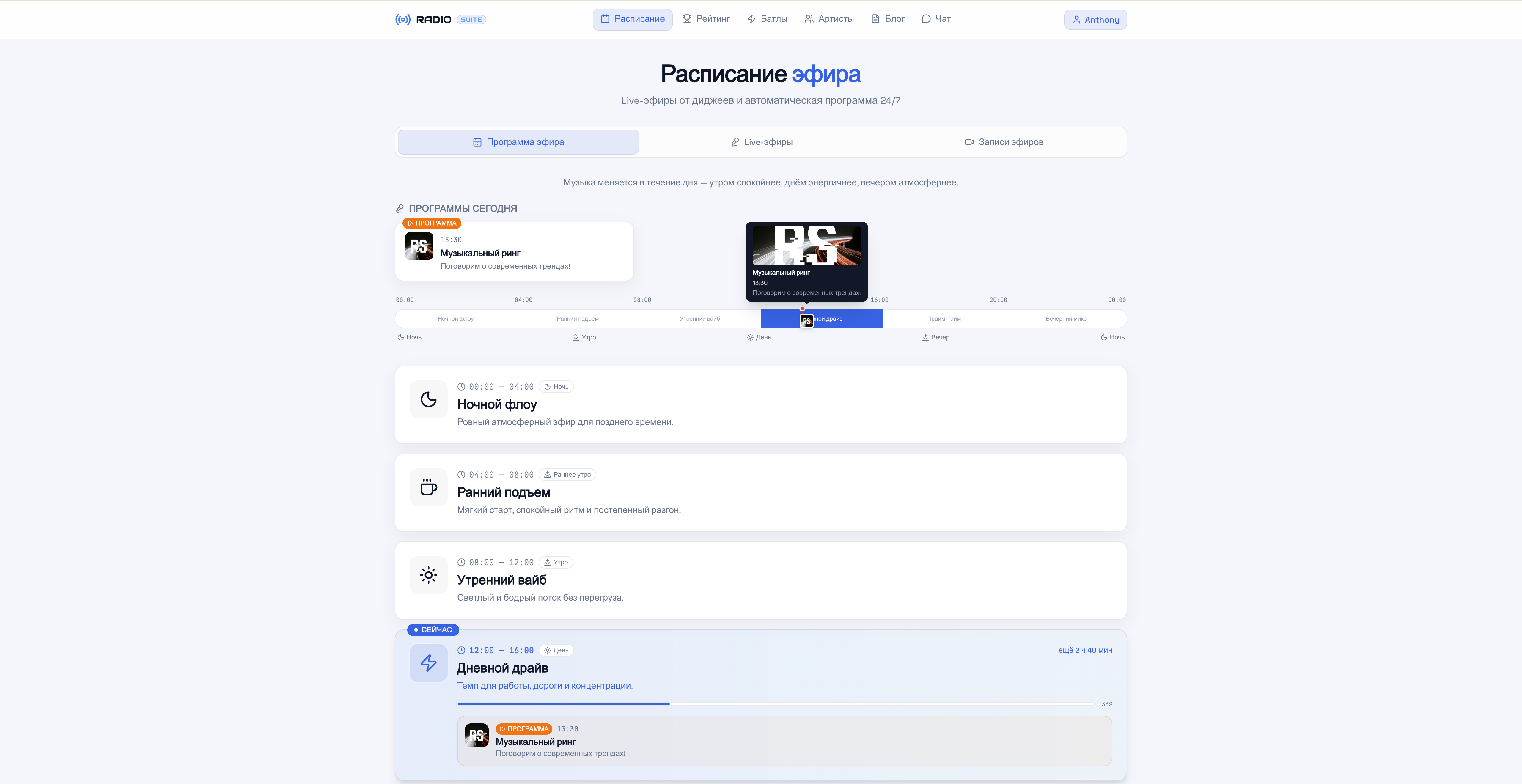 Автоэфир 24/7 с расписанием по слотам: утренние/дневные/ночные блоки, программные окна.