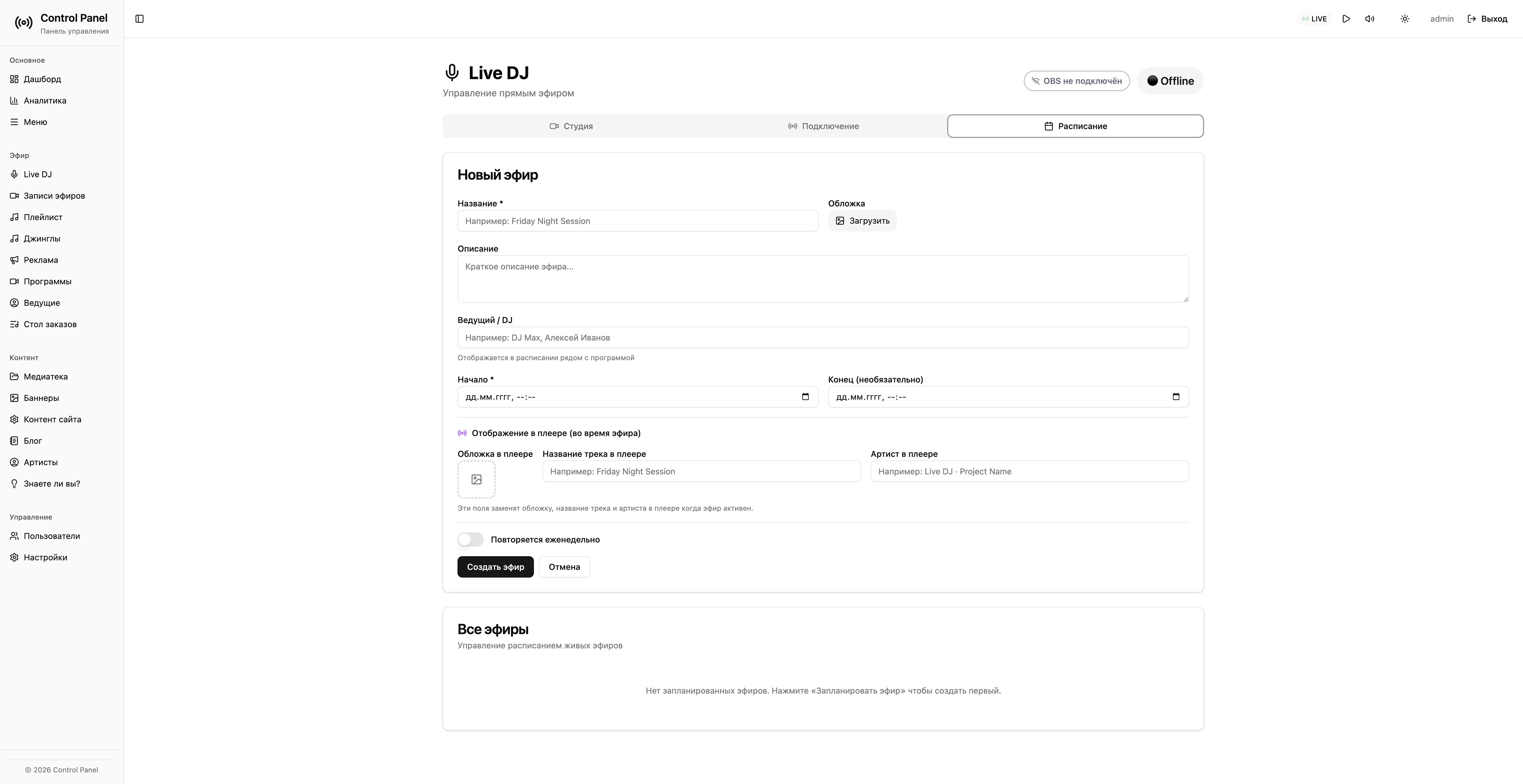 плейлисты и расписания;