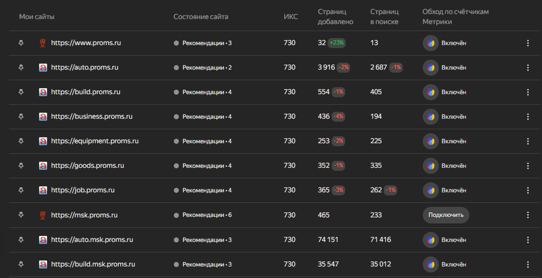 Proms.ru — специализированная онлайн-платформа в нише спецтехники, самосвалов и грузоперевозок. Основная аудитория проекта — это владельцы самосвалов, перевозчики, подрядчики и компании из строительной отрасли, а также владельцы карьерного и нерудного материала, которые ищут технику для выполнения работ. Эти группы активно используют сайт для размещения объявлений и поиска подрядчиков. Основной поддомен самый популярный auto.proms.ru